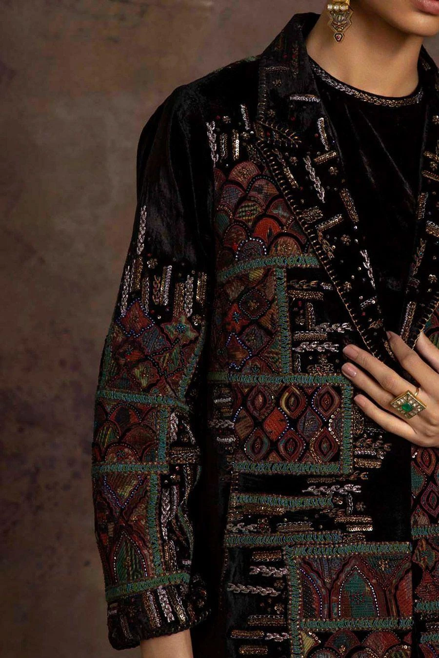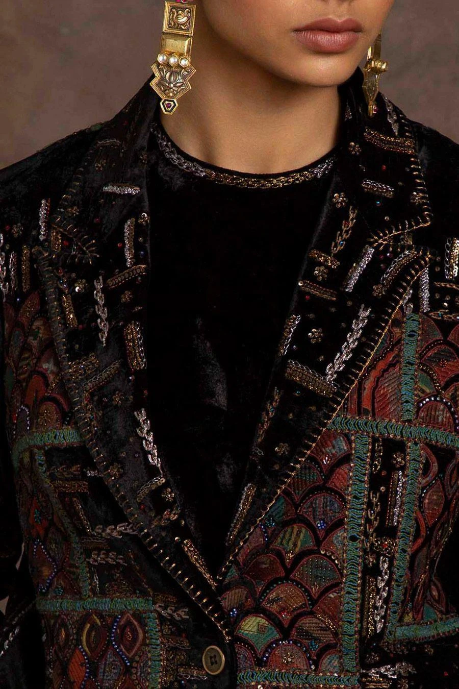 This velvet blazer features a semi-structured fit with hand embroidered beads sequence & zardozi work. Patchwork recycled hand-block printed Bagru silk has been used to create patterns inspired by the Jaali of æRushaansÆ.