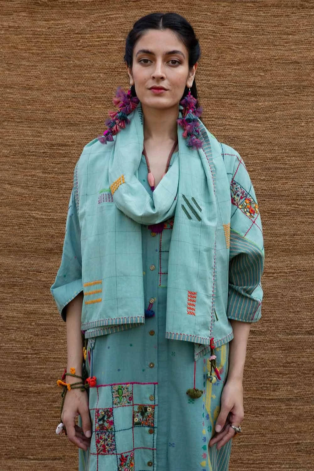 This blue stole is crafted in jamdani muslin along with embroidery stitch details, adding to the subtle craftsmanship & colour. You can wrap it around your neck with a coordinating kurta set for a dressed up look.