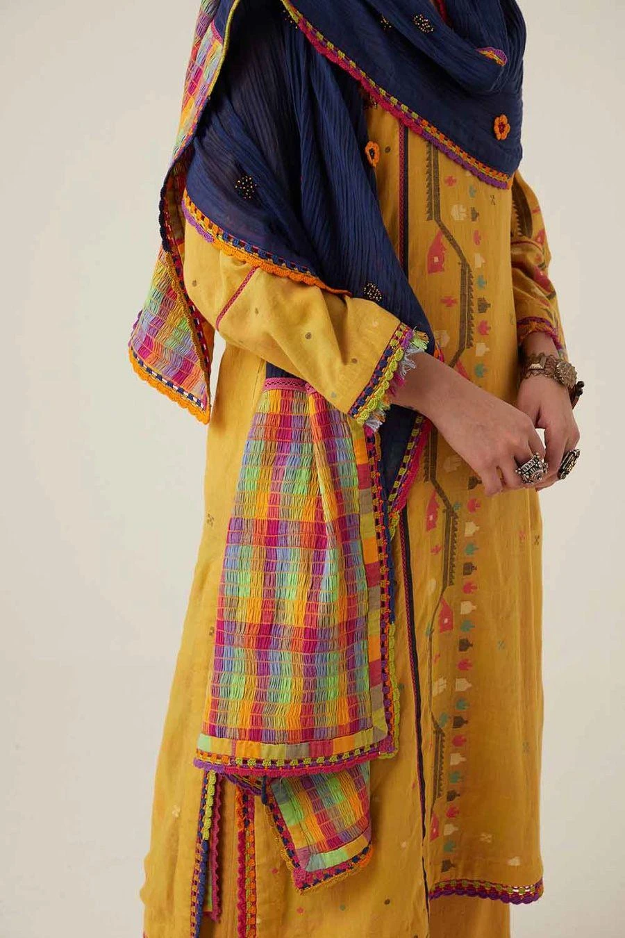 This gulzaar lace stole is created by silk chanderi textile and multicoloured smocked checks with an array of multicoloured crocheted flower details. It is finished with an all-round multicoloured crocheted lace border.