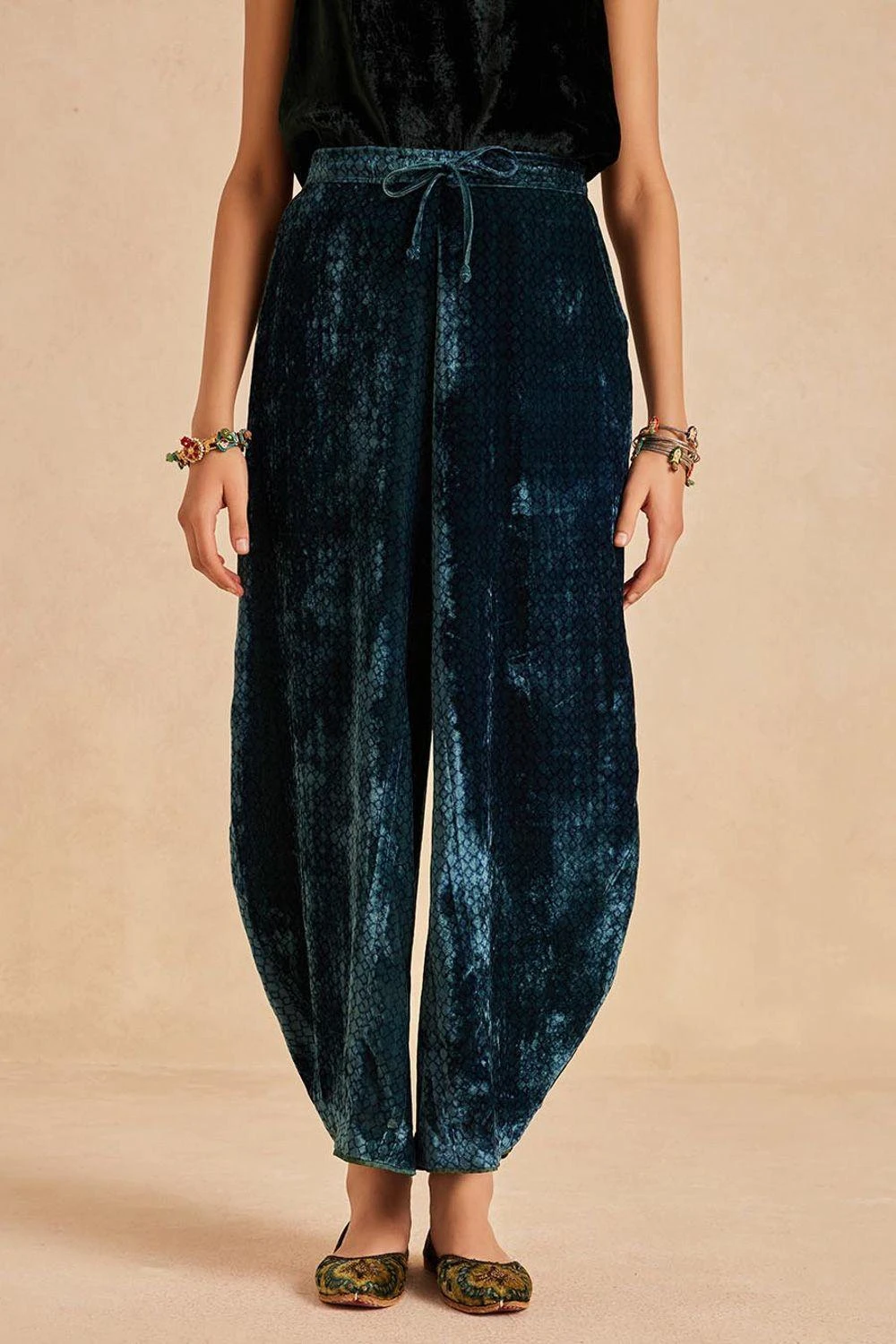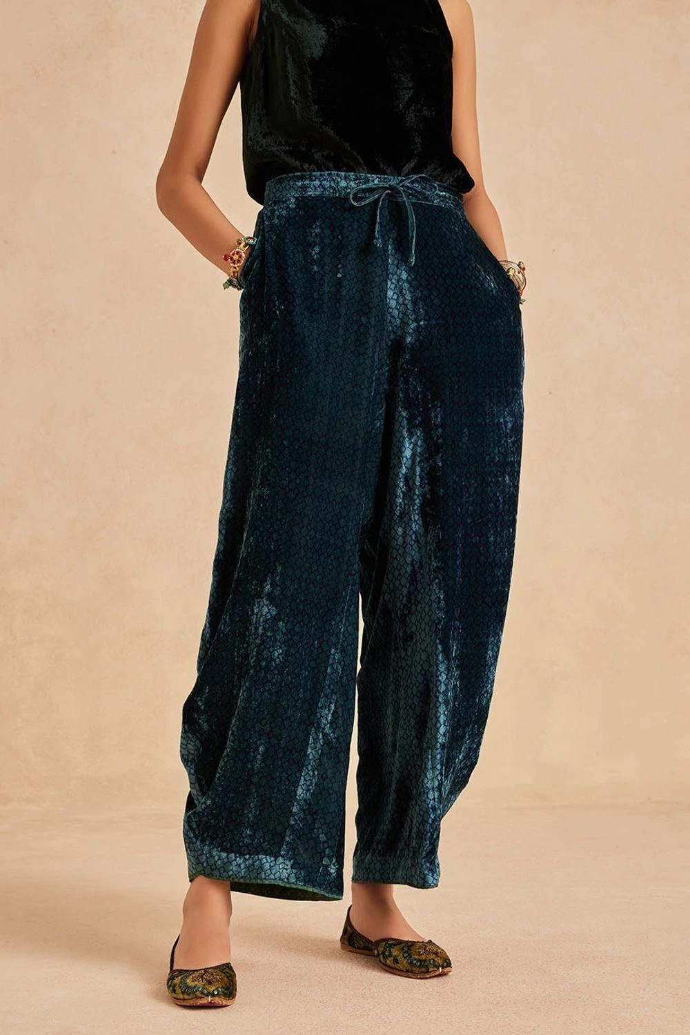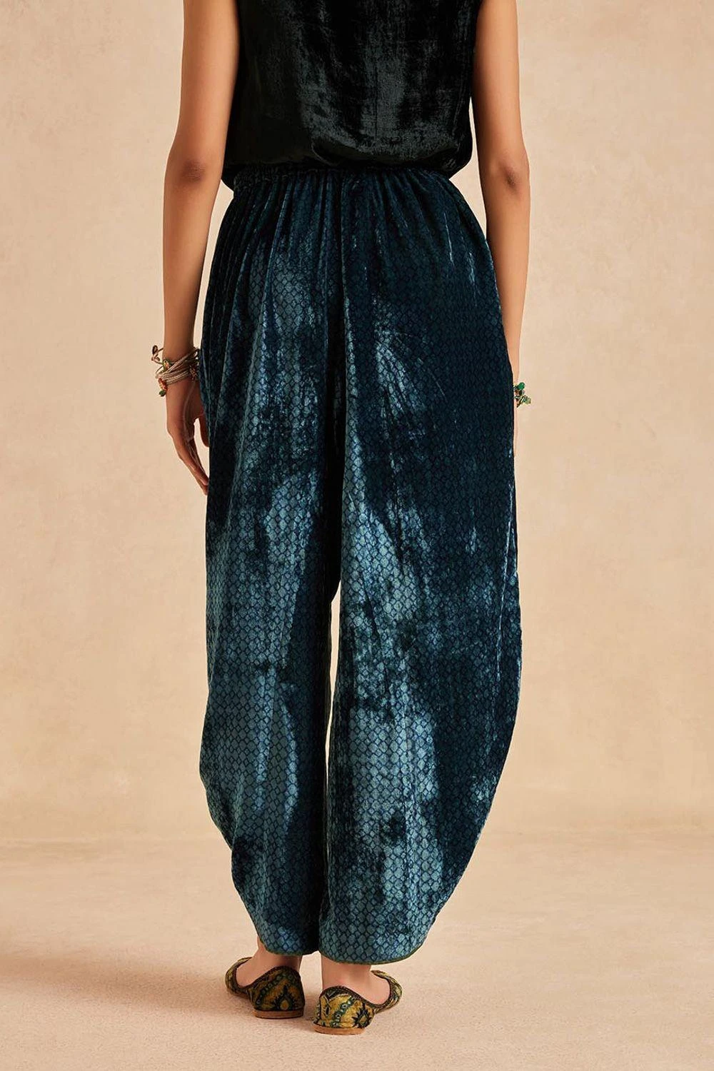 Step into elegance with these wide-legged cowl ijar. Crafted in Ajrakh hand-block printed velvet, it features a drawstring and elastic band for comfort.