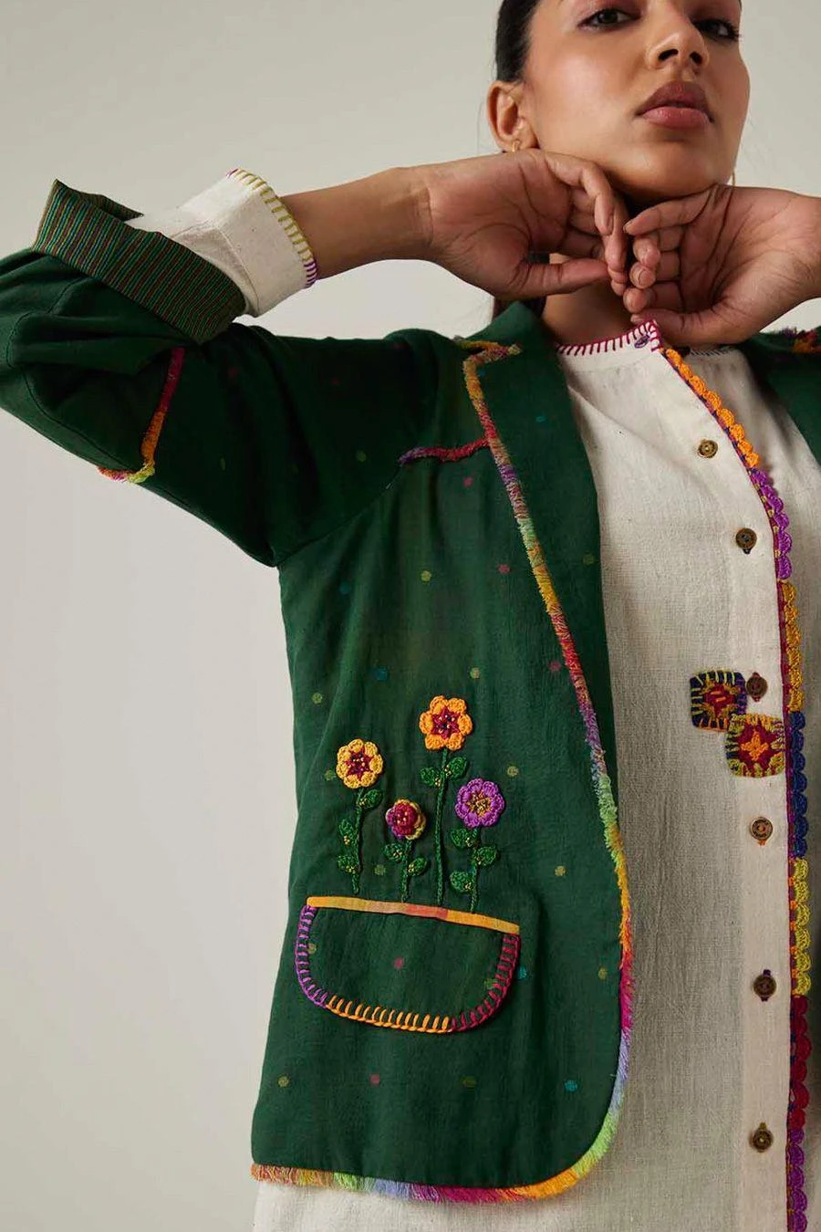 This jamdani blazer comes with an attached khadi kurta. The kurta features a band collar with crocheted laces where as the blazer features a notched lapel collar with multicoloured frayed khadi & flap pockets with intricate crocheted knitted flowers.