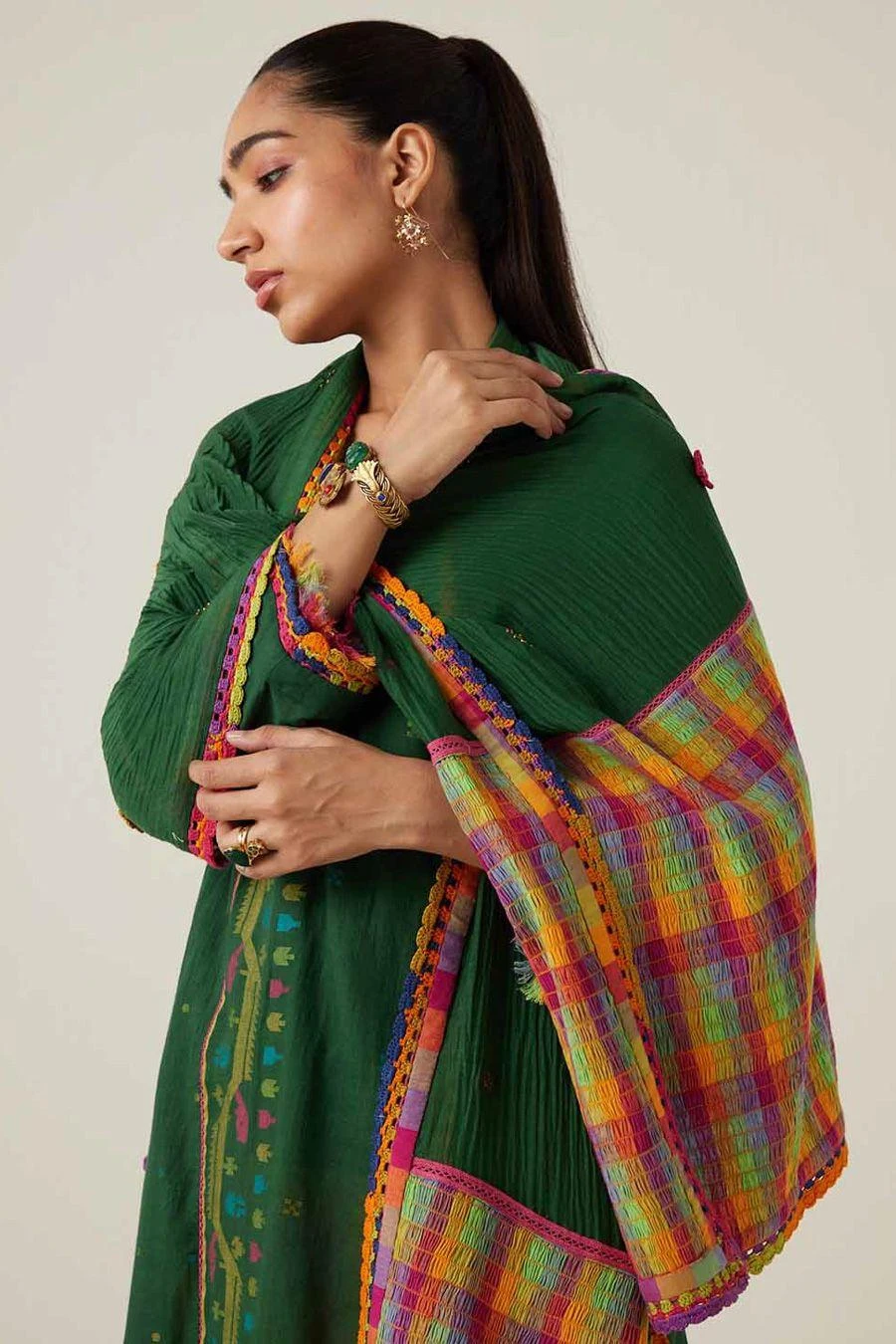 This gulzaar lace stole is created by silk chanderi textile and multicoloured smocked checks with an array of multicoloured crocheted flower details. It is finished with an all-round multicoloured crocheted lace border.