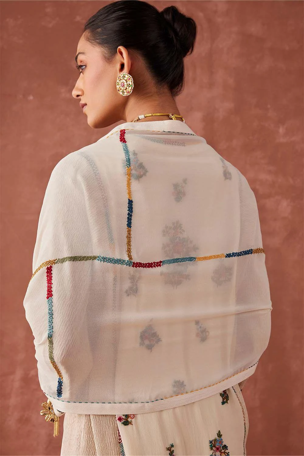 This stole crafted from sheer and lightweight silk organza fabric is adorned with multicolored embroidered stitch-lines, creating a captivating pattern.