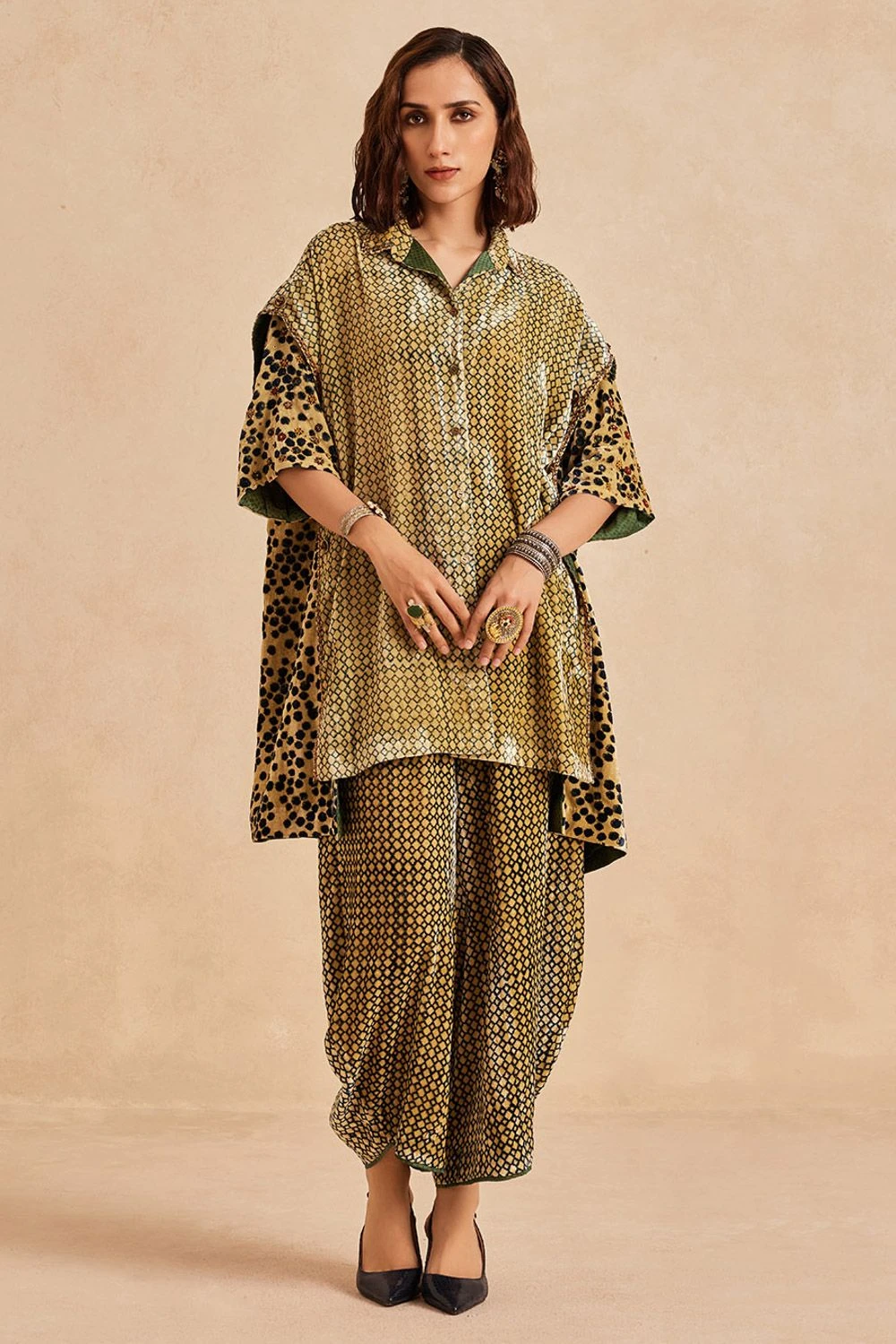 Indulge in luxury with this Oversized Velvet Shirt. The opulent Ajrakh hand-block print merges with intricate zardozi embroidery on extended side panels. The sleeves, adorned with Dabka, Tilla, and beads, elevate the glamour.