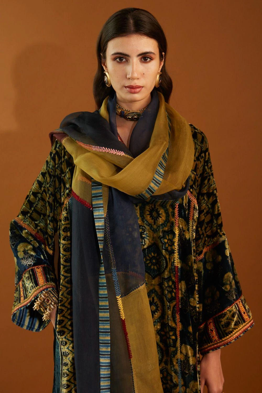 Accentuate your festive looks with this mustard organza dupatta. It is crafted in an array of juxtaposed earthy wintery hues, enhanced with ajrakh hand-block silk border & intricate embroidery details.