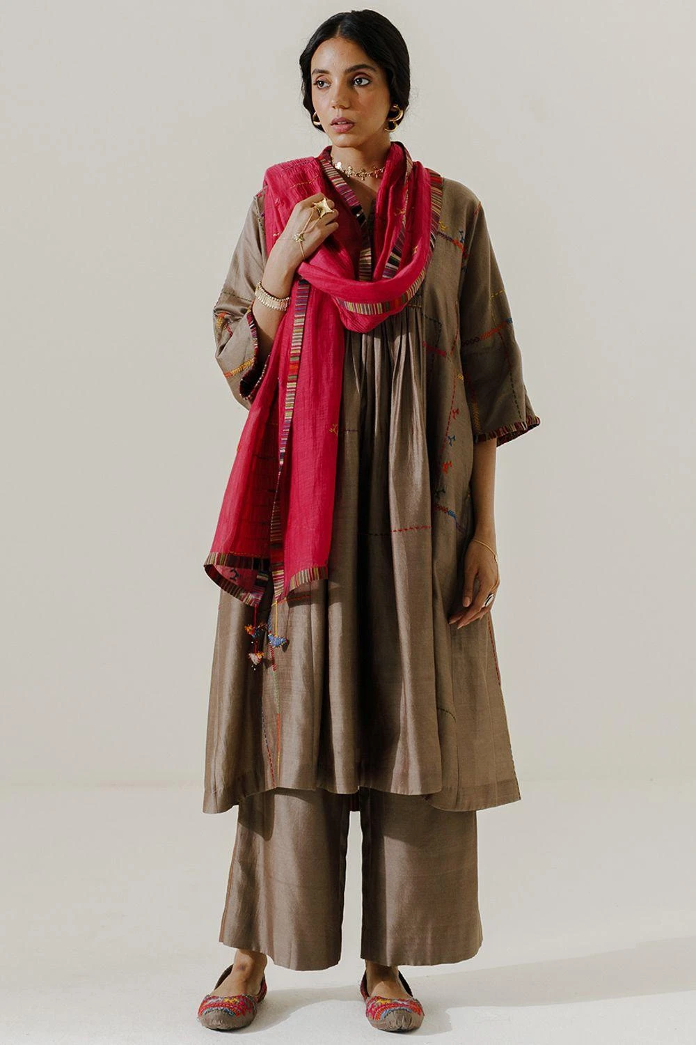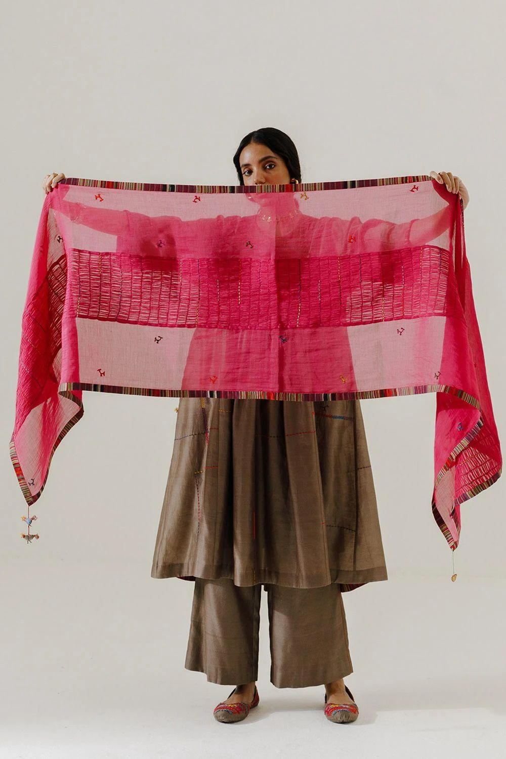 Take your layering game a notch higher with this pink stole. Crafted in handwoven chanderi, this stole features minimal embroidery and stitch details in bold colours. Layer this stole with a kurta set or a dress to complete the look.