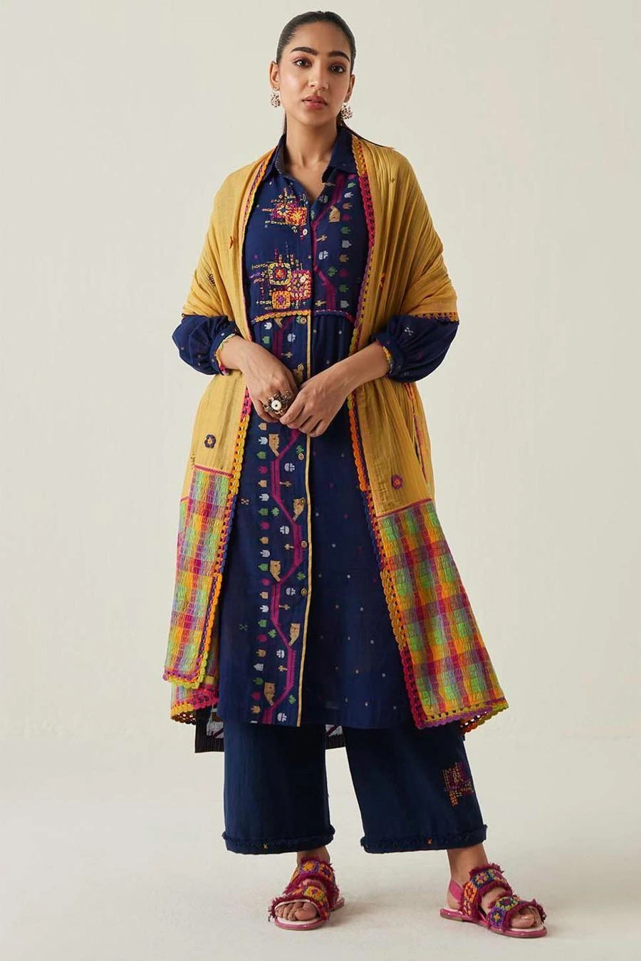 This gulzaar lace stole is created by silk chanderi textile and multicoloured smocked checks with an array of multicoloured crocheted flower details. It is finished with an all-round multicoloured crocheted lace border.