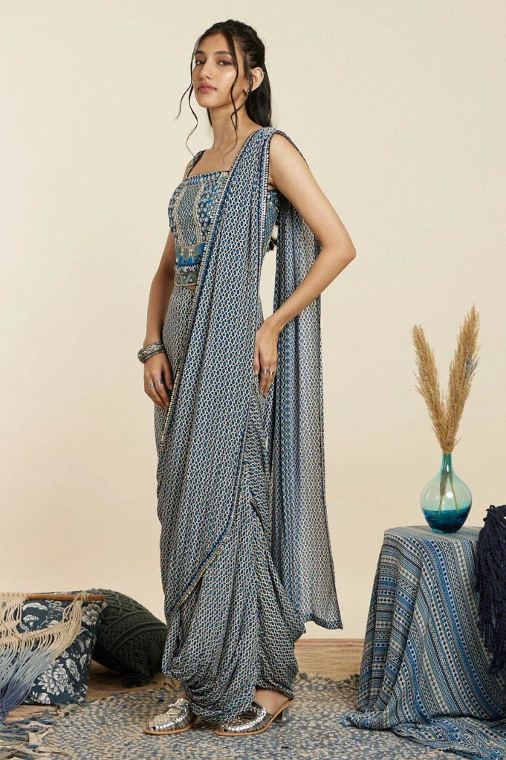 Step into opulent elegance with this abstract printed draped sari set. Setting the stage for an amazing look, this ensemble is a nod to the seamless meticulous craftsmanship with modern refinement.
