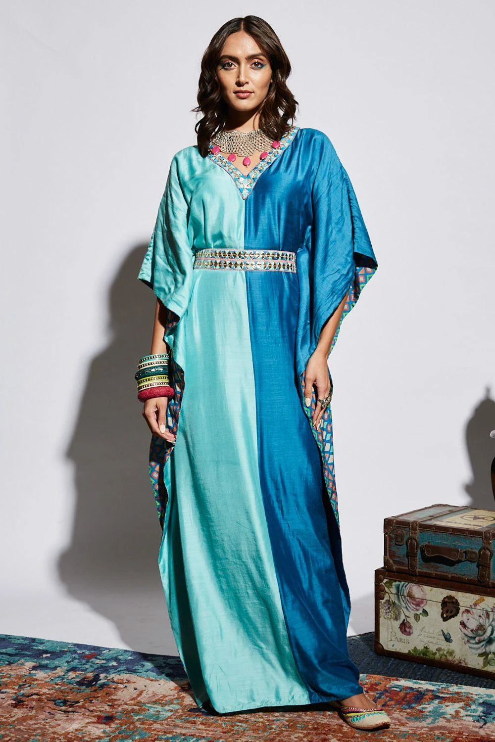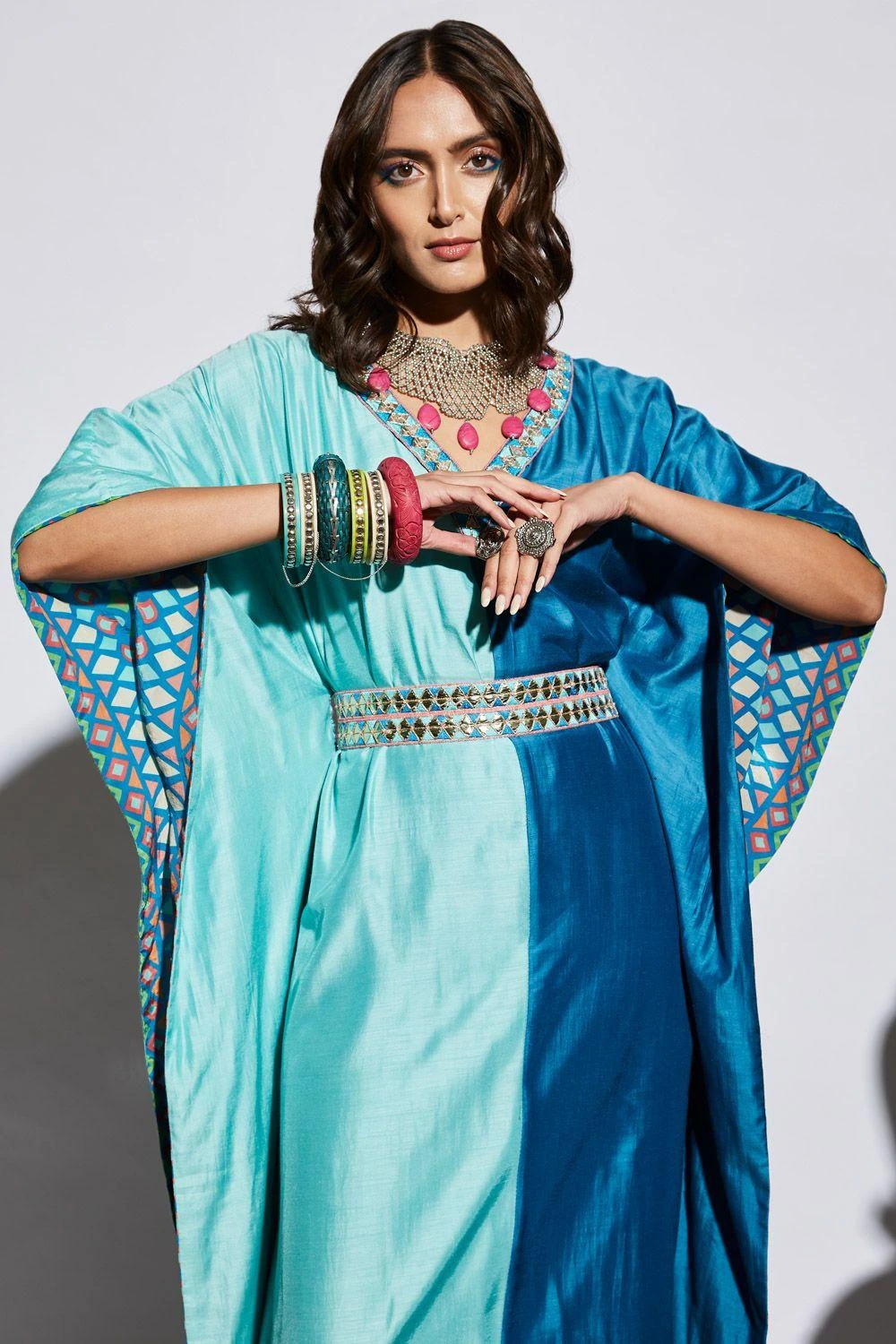This colour blocked kaftan is a great pick for your intimate festivities. It is cut in sumptuous silk fabric and highlighted with butti embroidery on the neckline. It is accentuated with a statement embroidered belt.