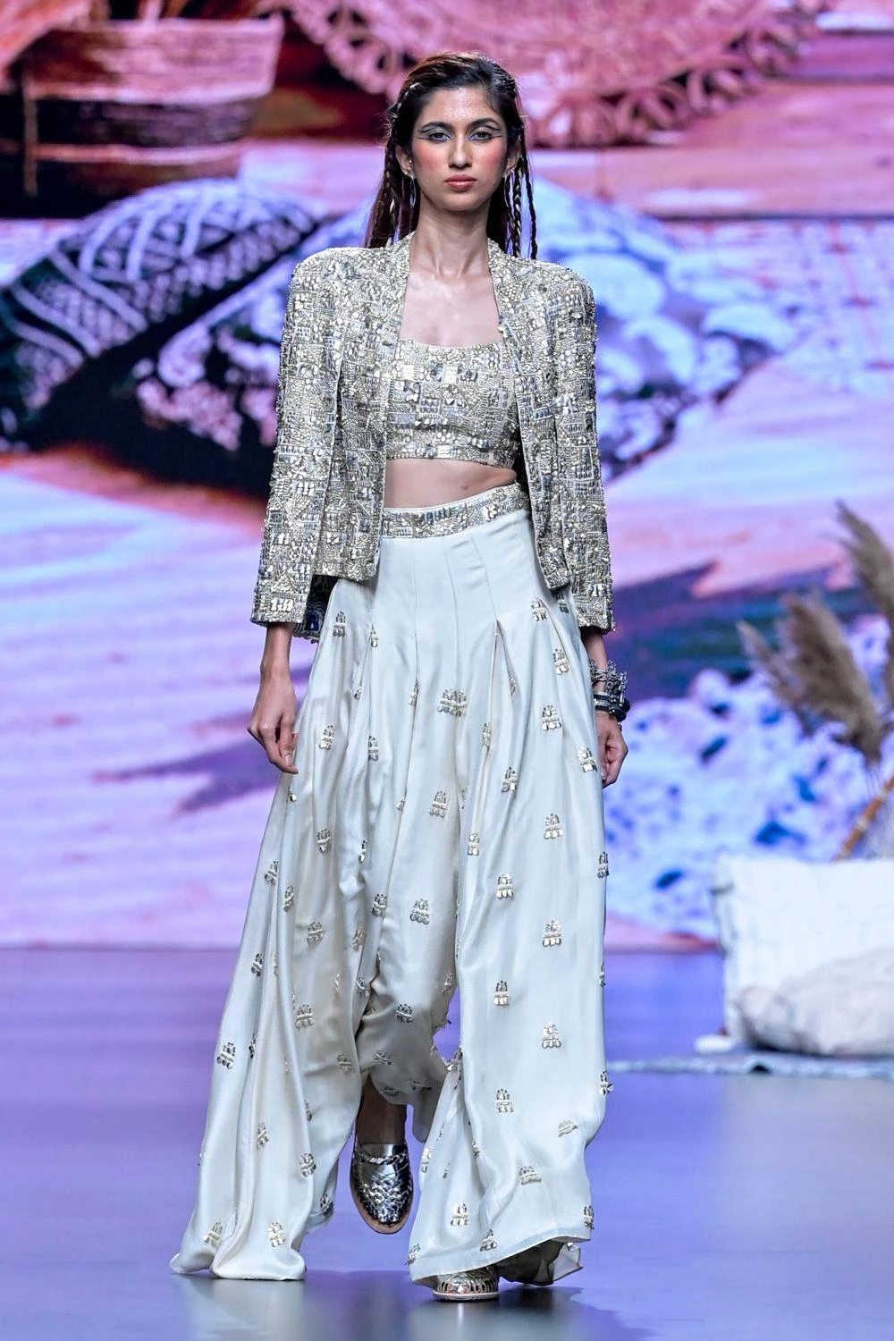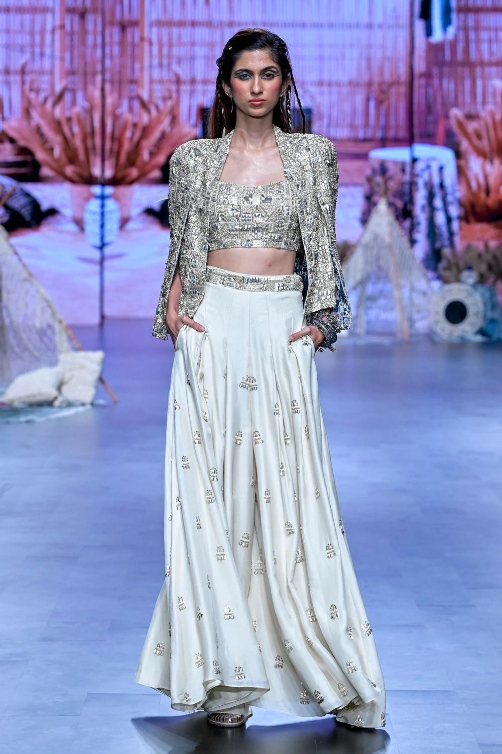 Step into opulent elegance with this embroidered jacket set. This ensemble is a testament to the perfect fusion of intricate craftsmanship and modern sophistication, setting the stage for a remarkable look.