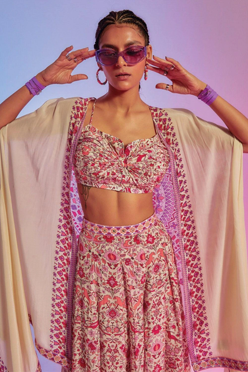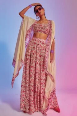 Summer festivties call for easy breezy clothing like this floral printed cape set. It features a crepe silk underbust bustier & box pleated pants, elevated with an ivory printed cape. Style it with a pair of statement earrings.