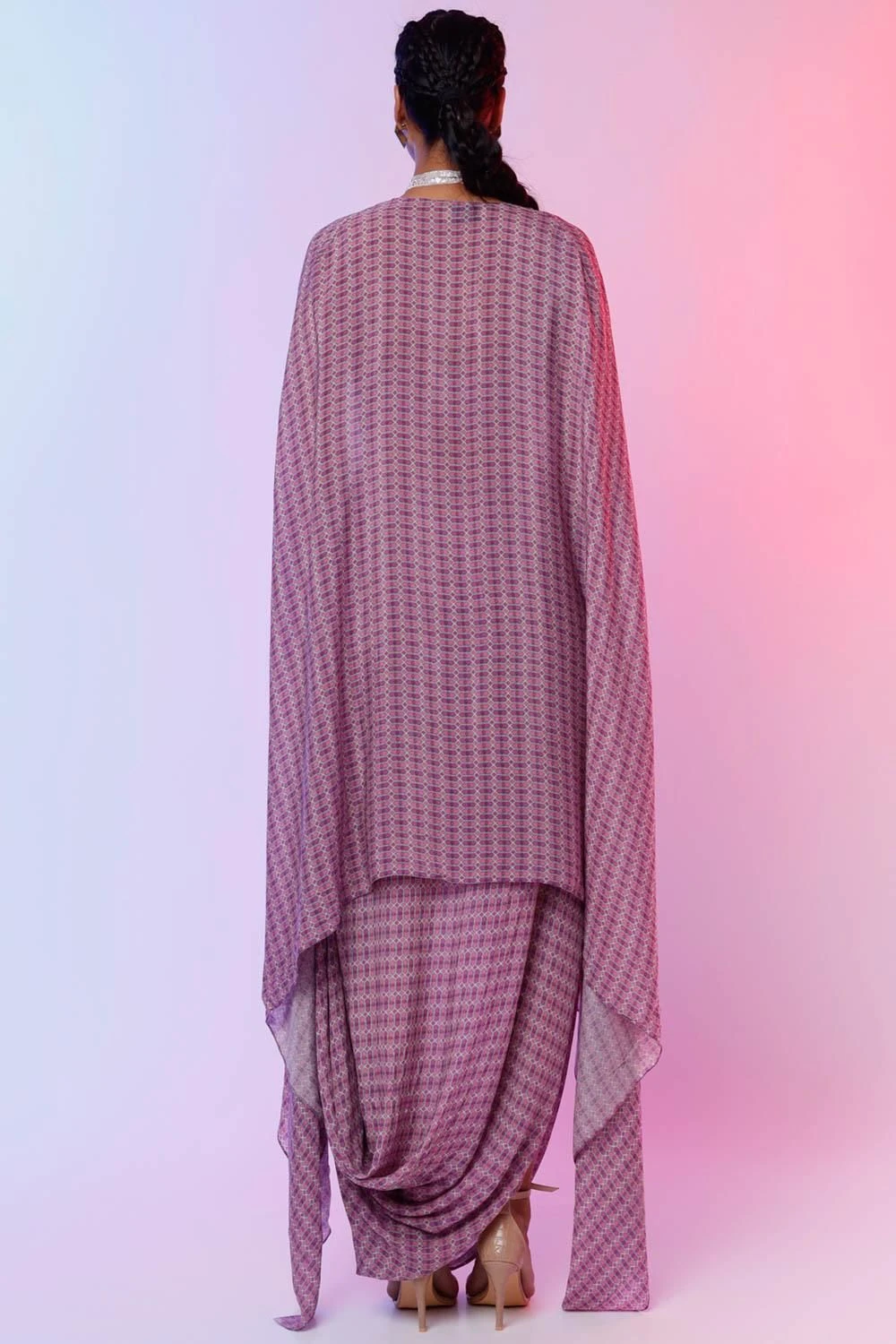 Swap your dupattas for capes this festive season. Cut in crepe silk, this set features a printed bustier paired with a matching cape & a draped skirt. Style it with a pair of statement earrings & a clutch to complete the look.