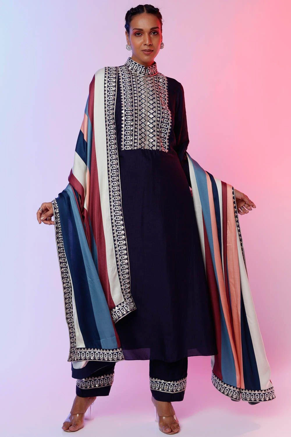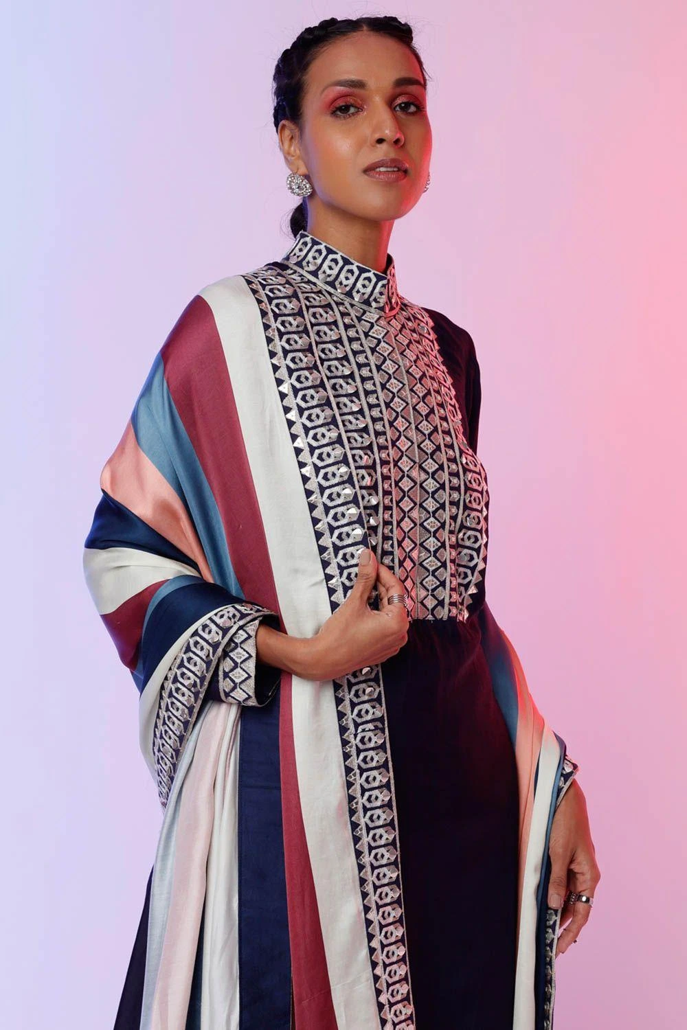 This kurta set will see you through all kinds of pre wedding festivities. It features a kurta with an embroidered yoke paired with a dupatta & pants. Style it with a pair of statement earrings & a potli bag to complete the look.