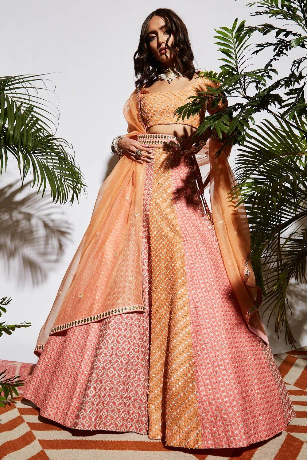 Ace your bridesmaid look in this pink & orange multi-kali lehenga set. It is made in raw silk and adorned with buttis all across the lehenga. It is paired with a matching orange blouse and a sheer dupatta.