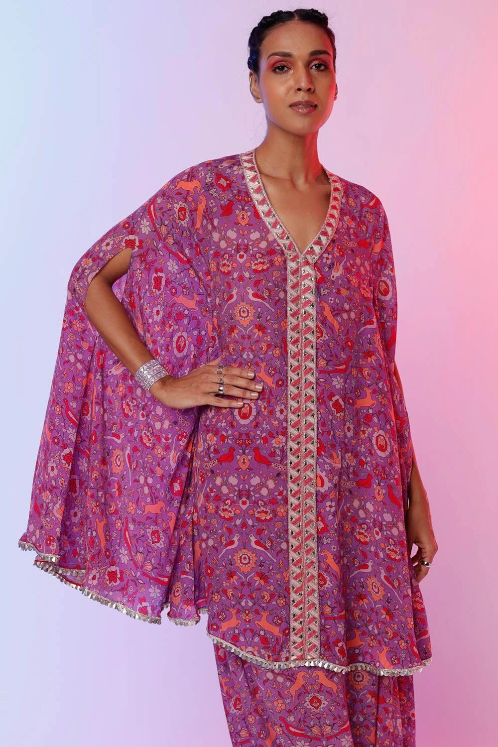 Swap your dupattas for capes this festive season. Cut in crepe silk, this set features a cape style tunic paired with a cowl style skirt. Style it with a pair of statement earrings & a clutch to complete the look.