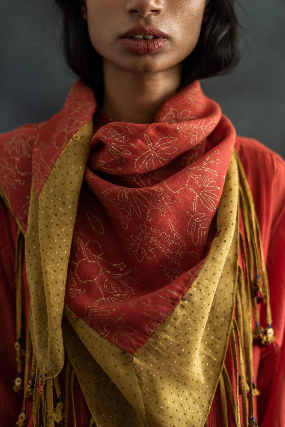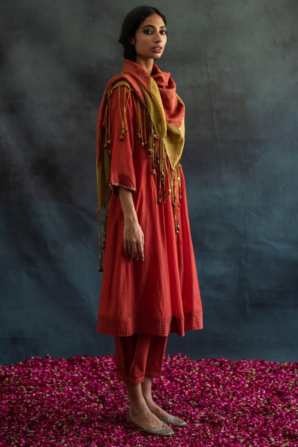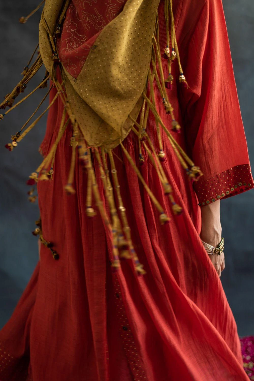 This henna green scarf is crafted in chanderi mul and features a hand block printed tassel details with metal sequins. You can wrap it around your neck with a coordinating kurta set for a dressed up look.