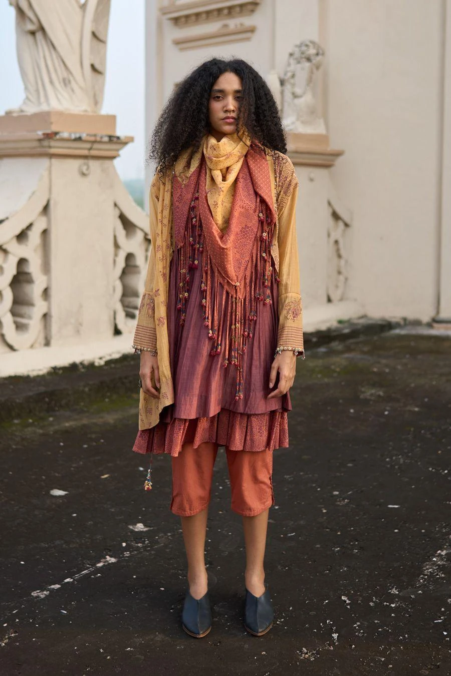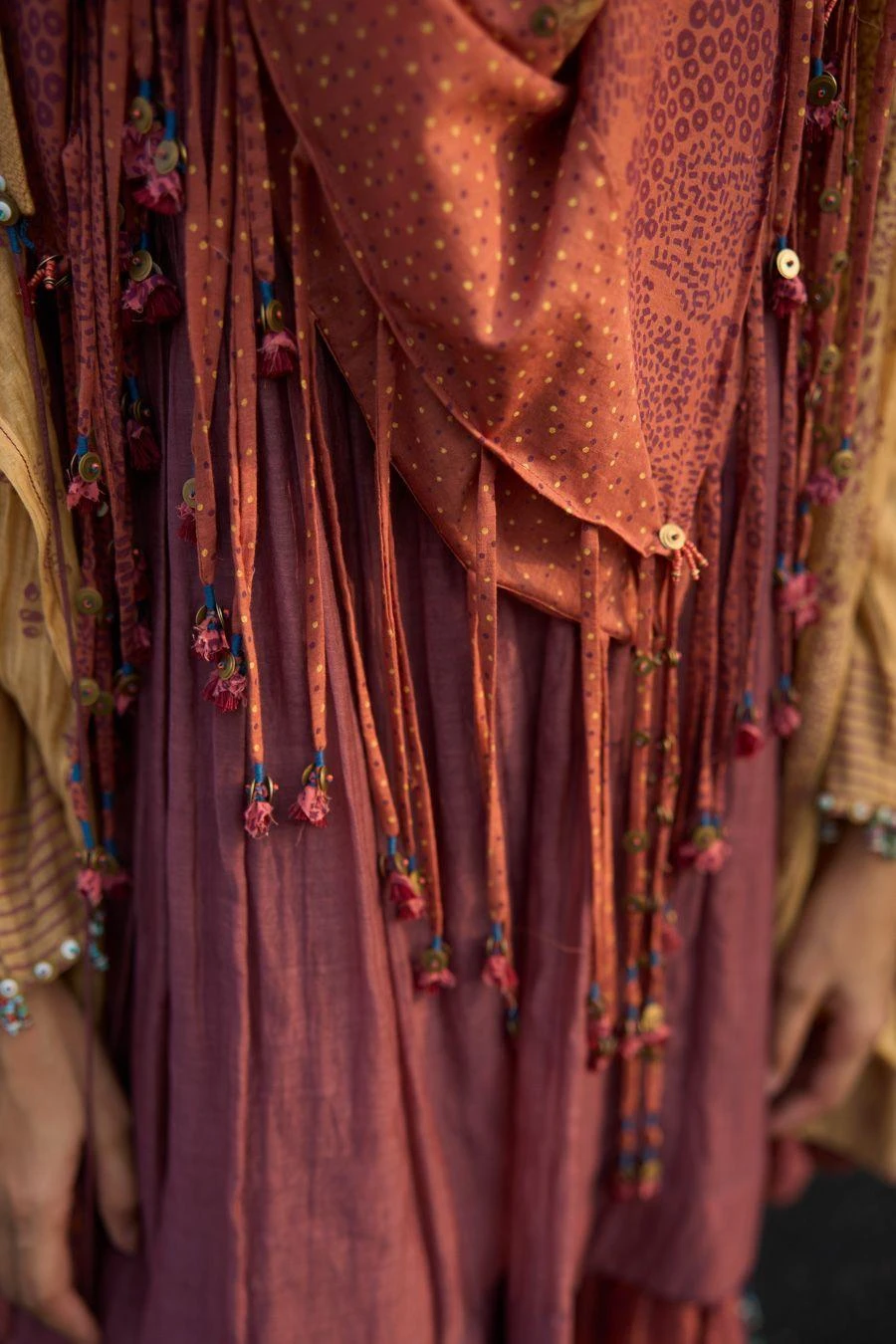 Take your layering game a notch higher with this pink stole. Crafted in handwoven chanderi, this hand block printed stole features tassel embellishment with appliqued motifs.