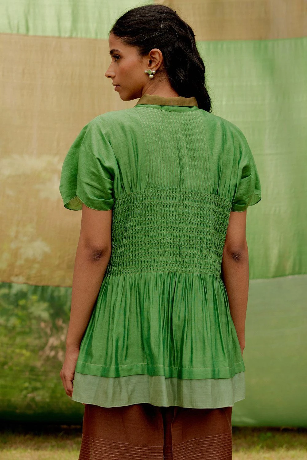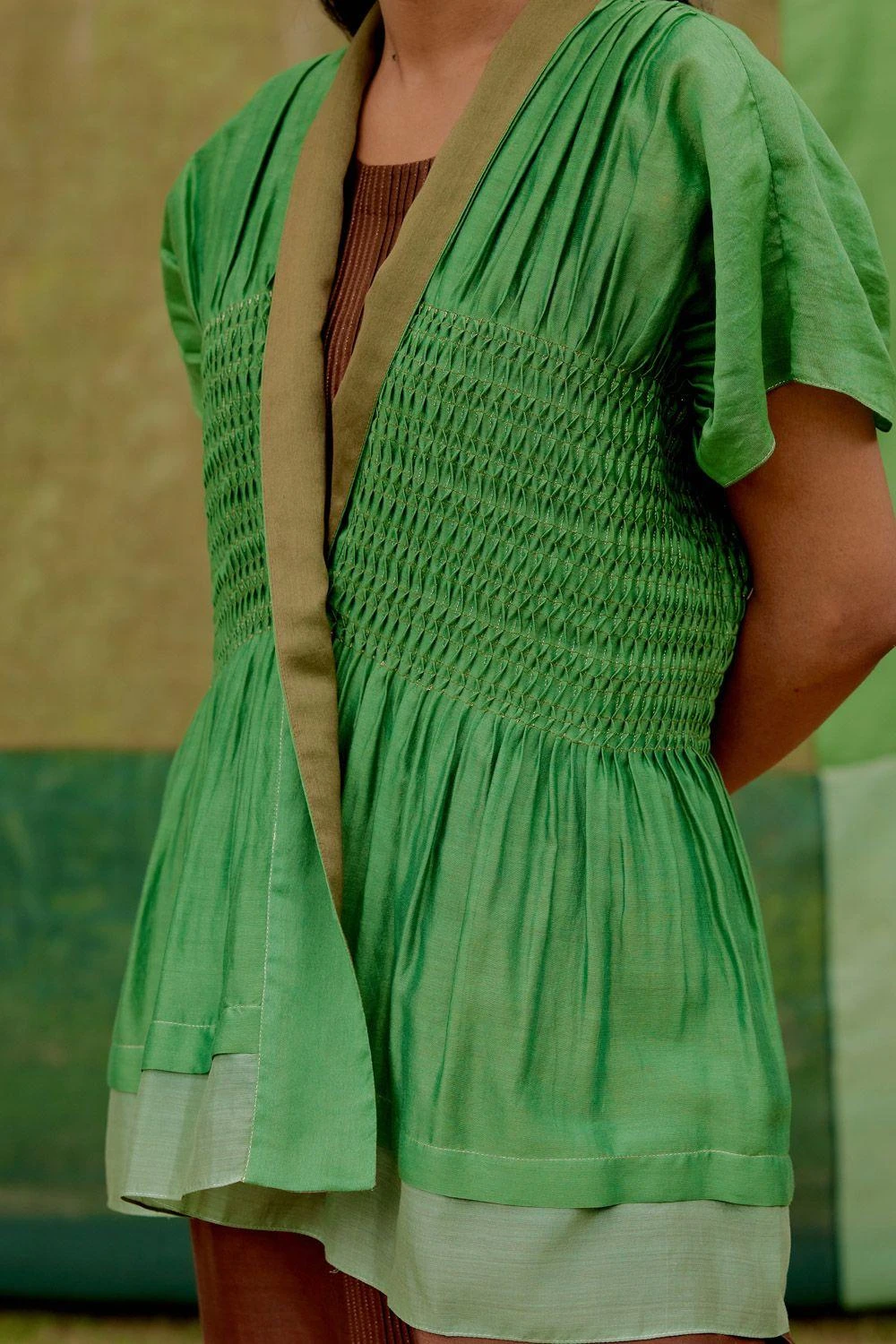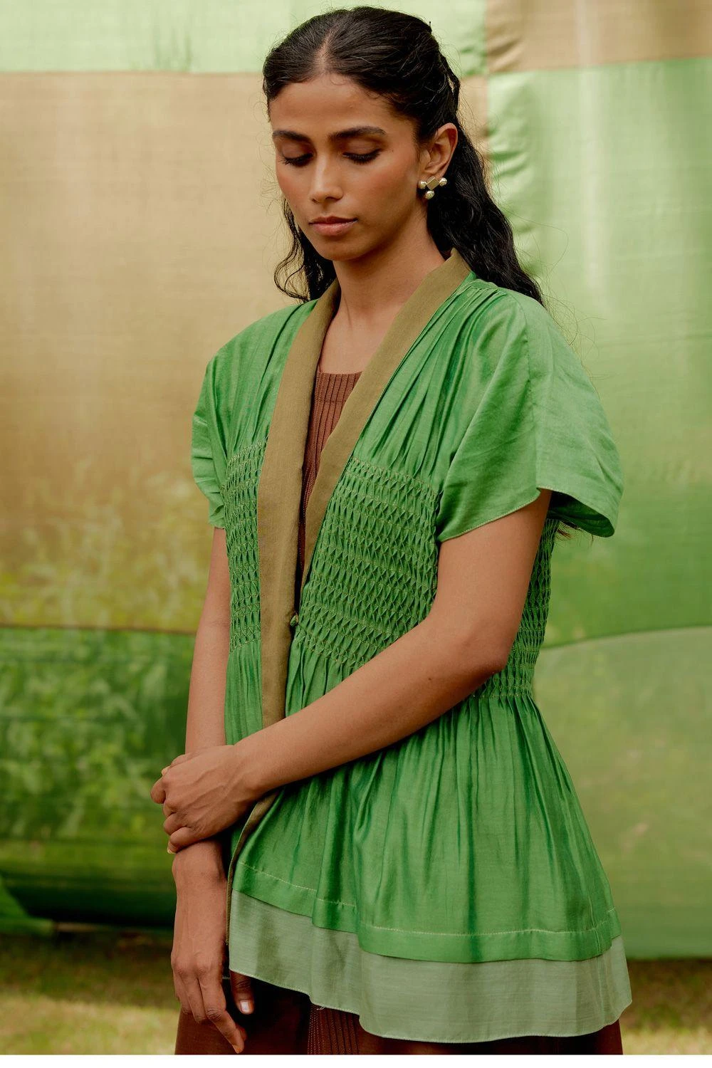 From your work desk to the brunch table & from lounging at home to catching flights, you can always count on this top. Crafted in handwoven silk chanderi, this top features zari texture details with hand crocheted buttons.