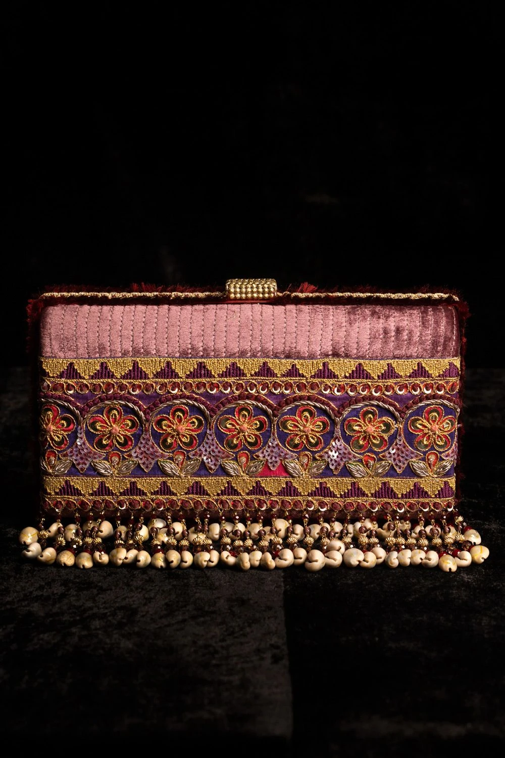 Let your plus one be a boho-chic clutch this festive season. This clutch features a hand embroidered braid & quilting finished with kodi shell fringing & a beaded chain handle. Style this exquisite piece with Indian wear to add elegance to your look.