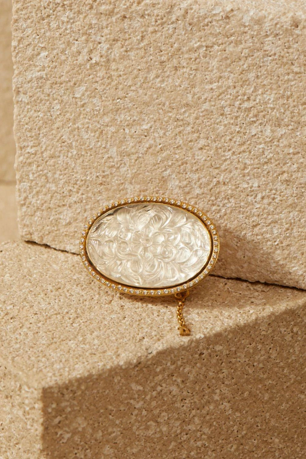 Handcrafted in 92.5 silver, this belt buckle features hand-carved fluorite stone and is surrounded by small cubic zirconia crystals. It is finished with 22-carat gold plating. Dress this buckle up with a brocade lehenga.