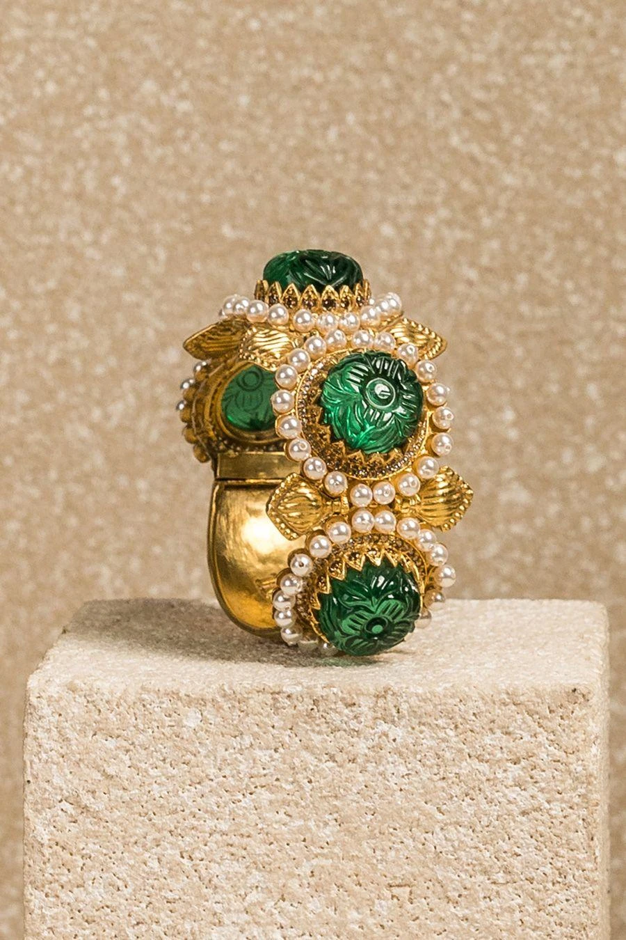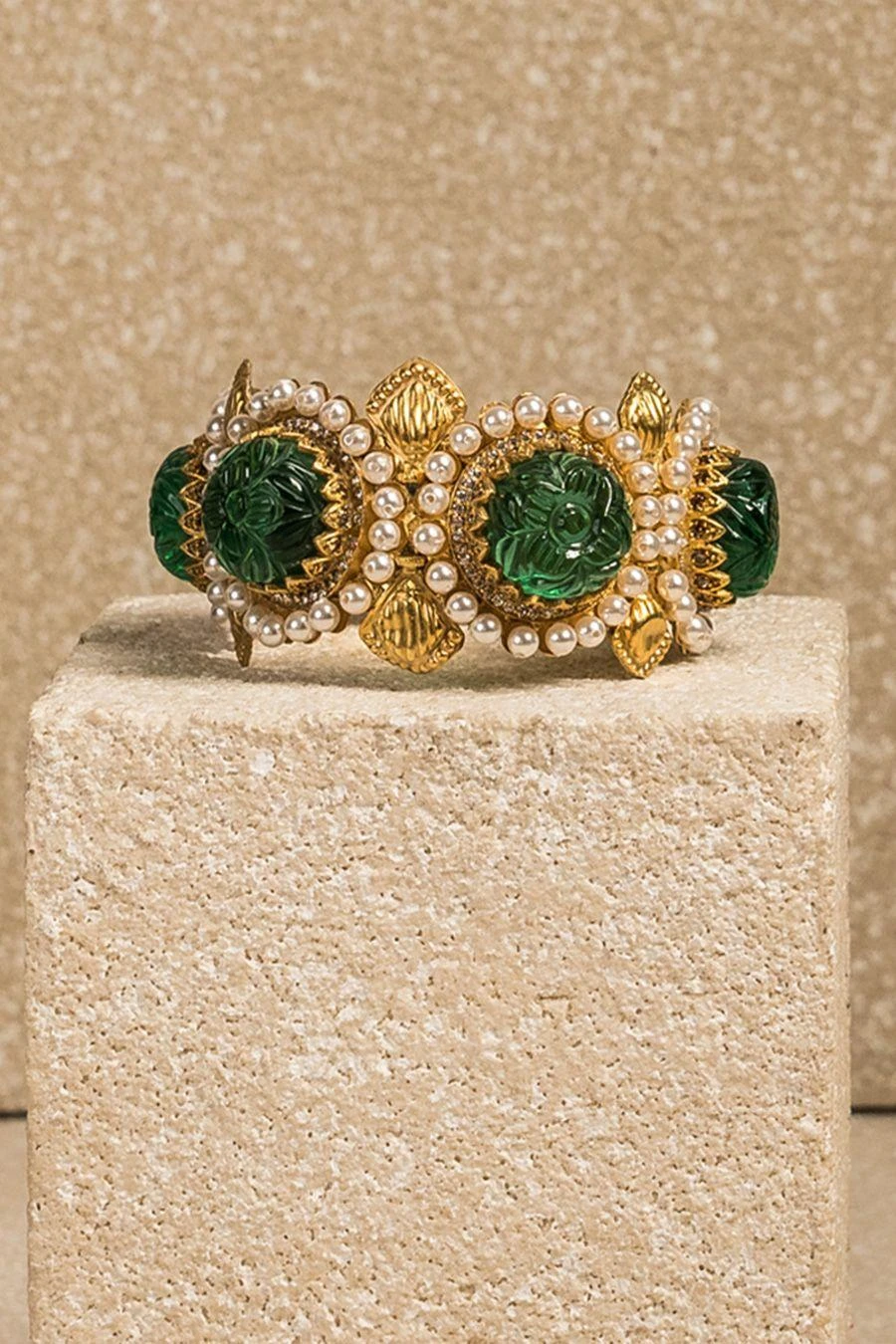 This statement kada embellished with hand carved cabochons in the center in 92.5 sterling silver, dipped in 24K gold polish comes with an openable lock mechanism for easy wear and better fit.