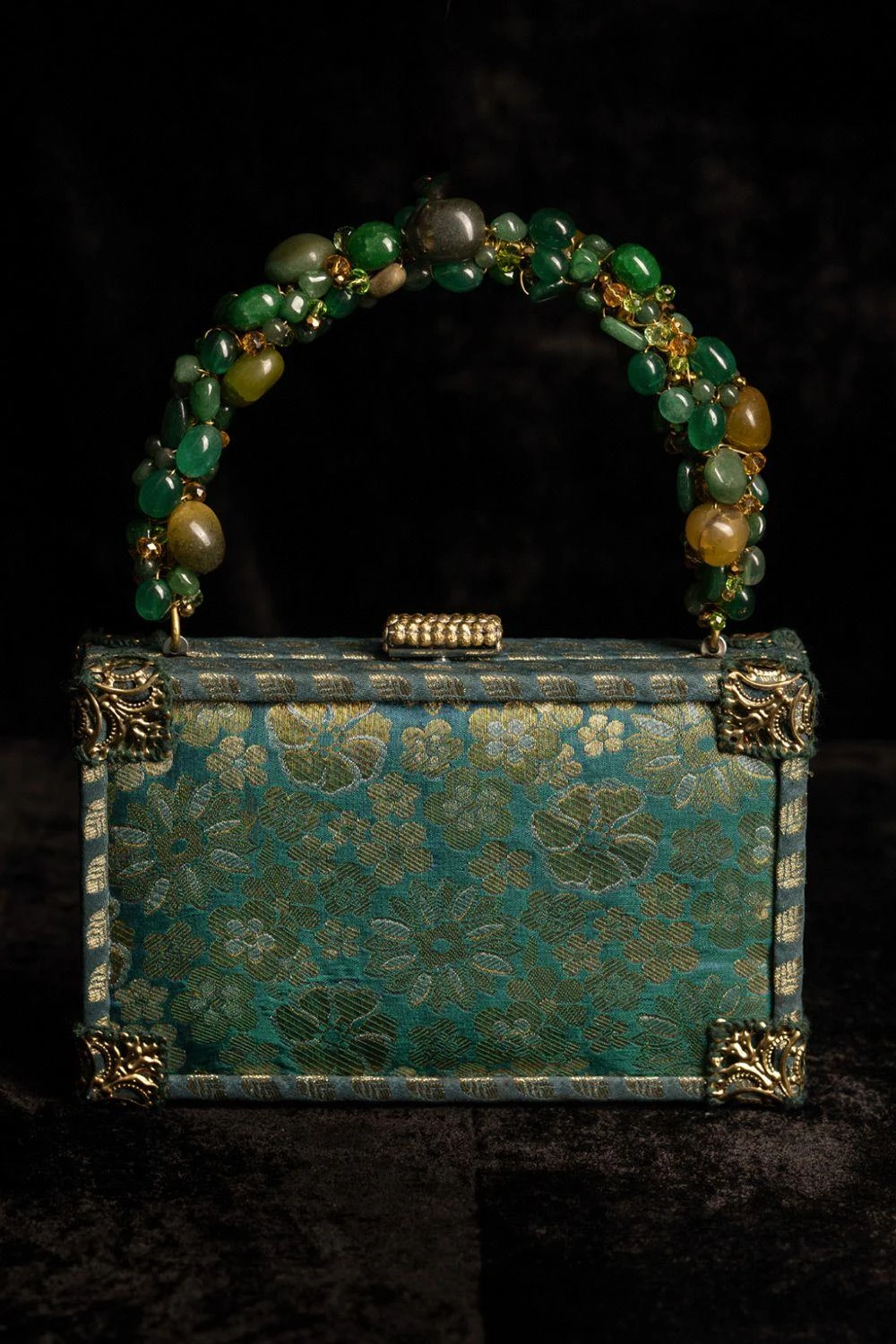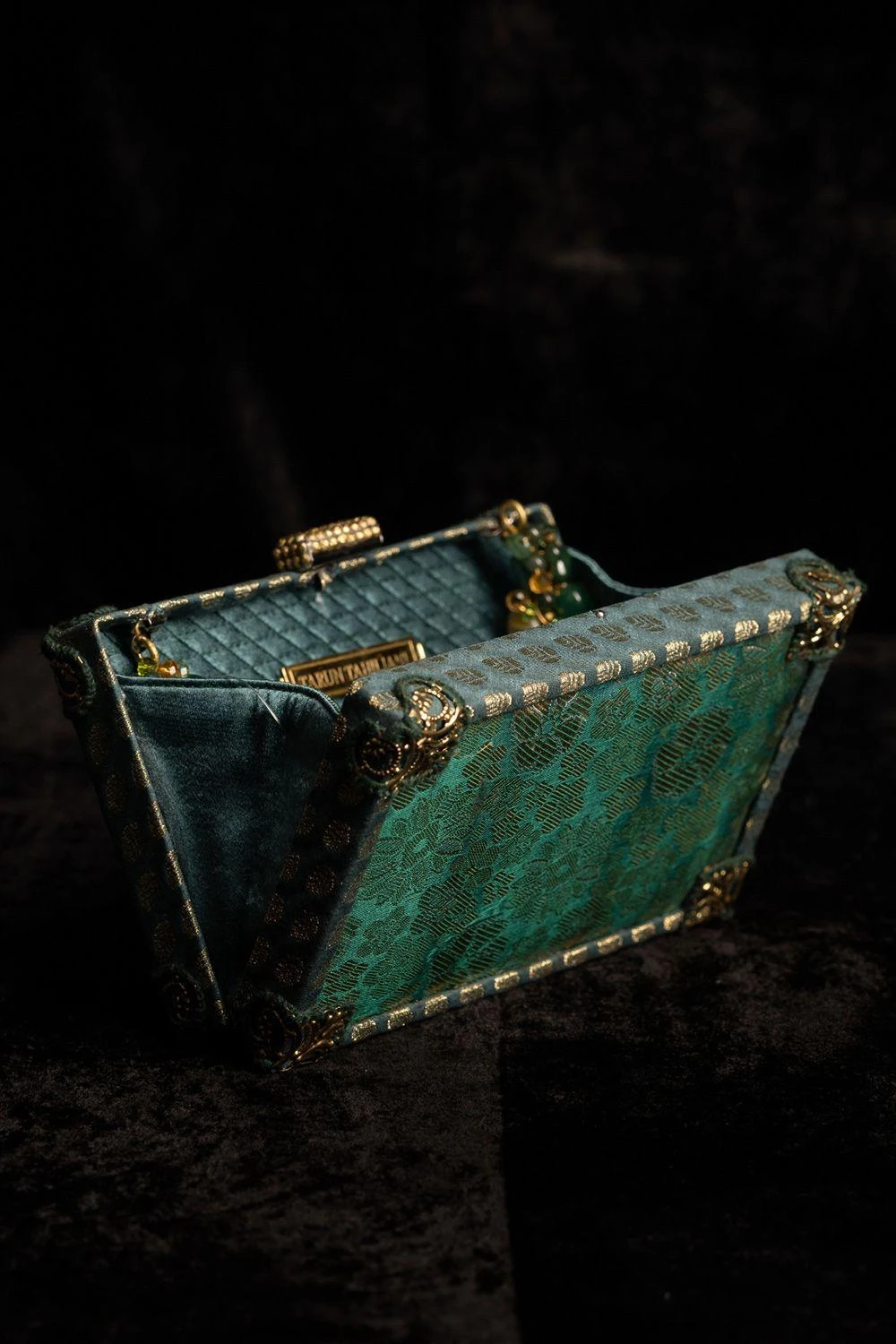 Let your plus one be this emerald hand-woven phool chadar brocade case bag this festive season. It features a beaded handle. Style this exquisite piece with Indian wear to add elegance to your look.
