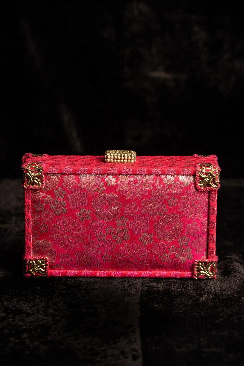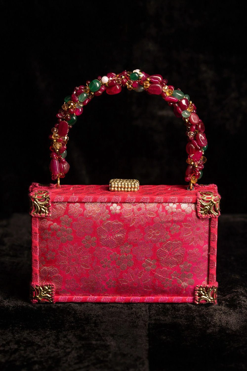 Let your plus one be this fuchsia hand-woven phool chadar brocade case bag this festive season. It features a beaded handle. Style this exquisite piece with Indian wear to add elegance to your look.