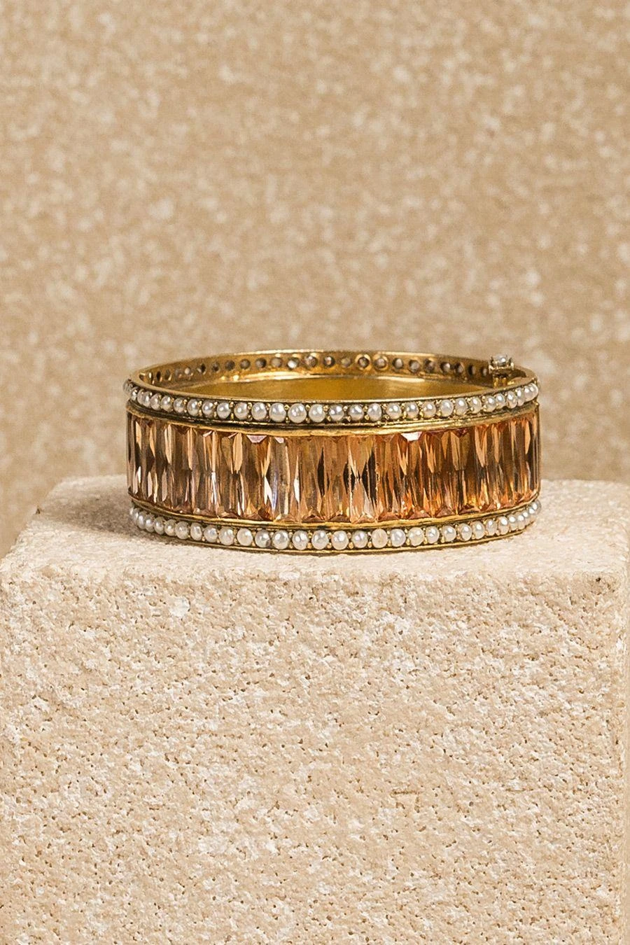 Handcrafted in 92.5 sterling silver, and dipped in 24K gold polish this classic Baguette bangle is edged with fresh water pearls. It comes with an openable lock mechanism for easy wear and better fit.