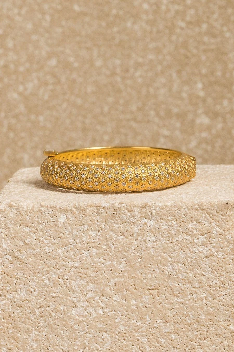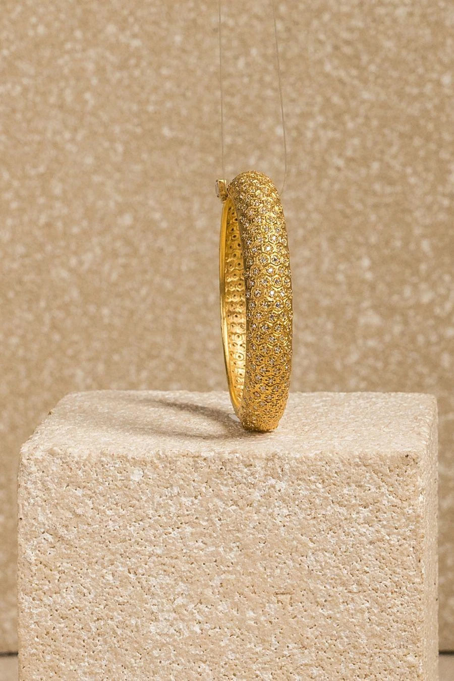 Handcrafted in 92.5 sterling silver, dipped in 24K gold polish this classic Zircon studded bangle comes with an openable lock mechanism for easy wear and better fit.