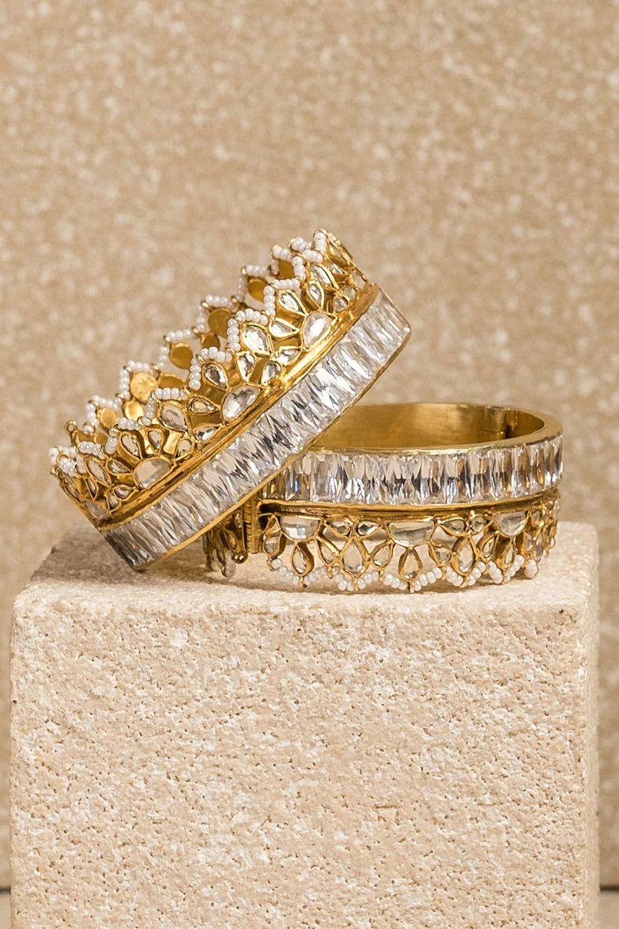 Handcrafted in an intricate floral border, this 92.5 sterling silver bangle dipped in 24K gold polish feature a beautiful line of zircon baguettes. It comes with an openable lock mechanism for easy wear and better fit.