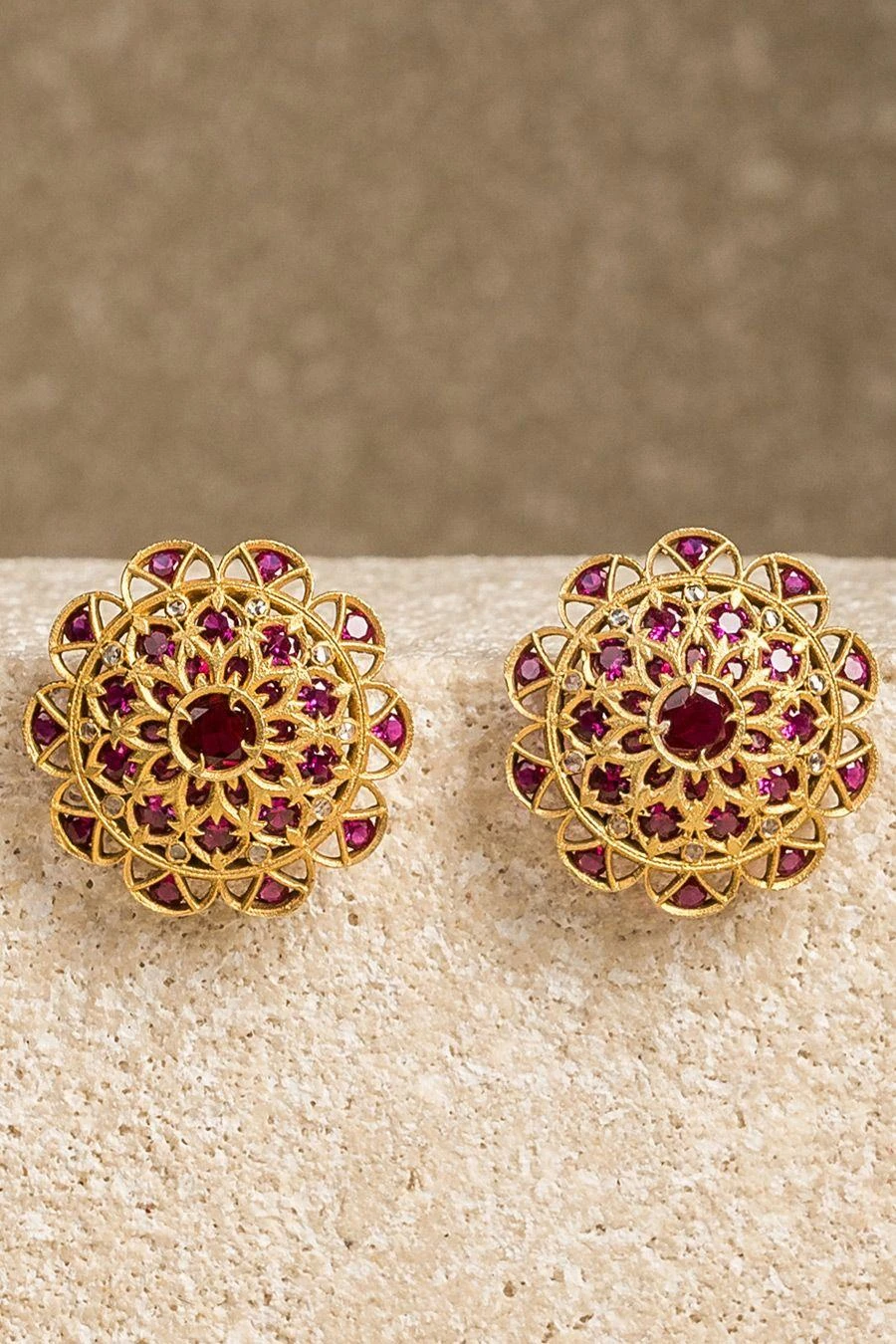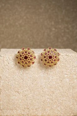 Intricately designed, these stud earrings in 92.5 silver metal are finished with 24K gold dipped polish. They are embellished with hand cut glass stones.
