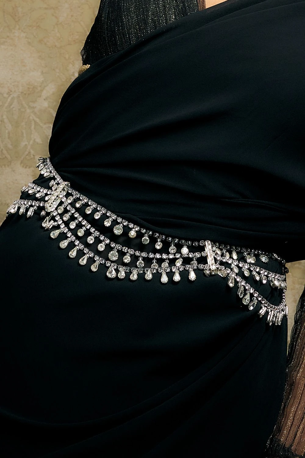 Indulge in timeless elegance with this Swarovski crystal belt. Adorned with exquisite stone crystal drops, it captivates with its refined allure. The adjustable chain guarantees a perfect fit, while the TT charm drop adds a touch of sophistication.
