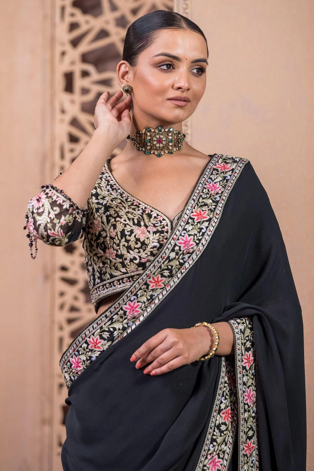 This silk-georgette sari is accentuated with a thick floral border & is detailed with crystal fringes. It is paired with an intricately hand-embroidered blouse in georgette with 3/4th sleeves. Add a pair of statement earrings to complete the look.
