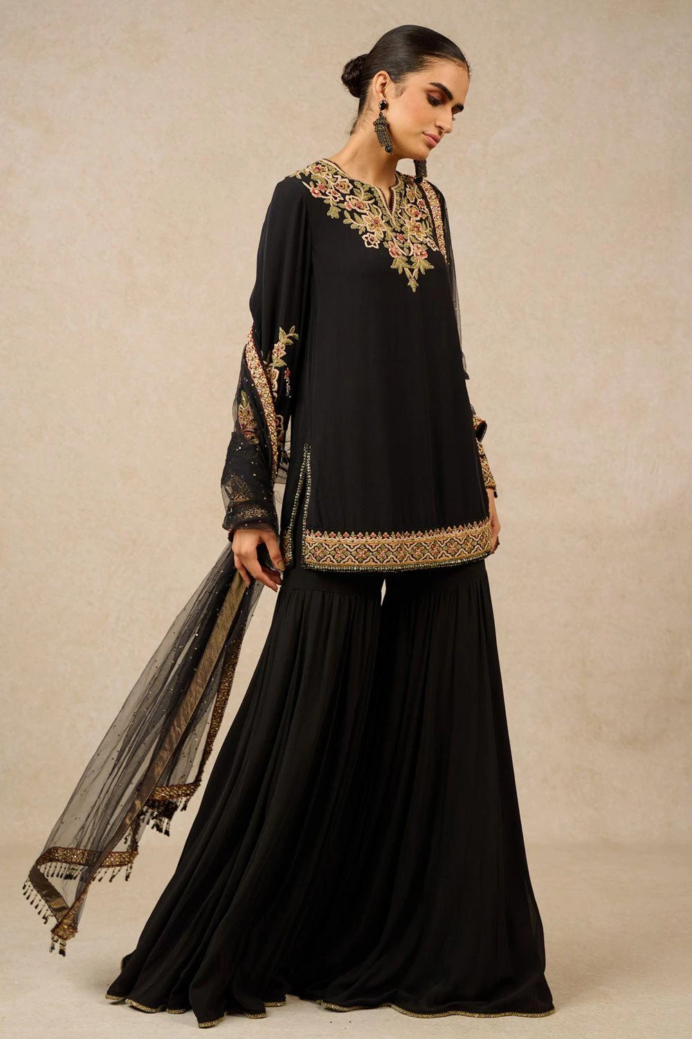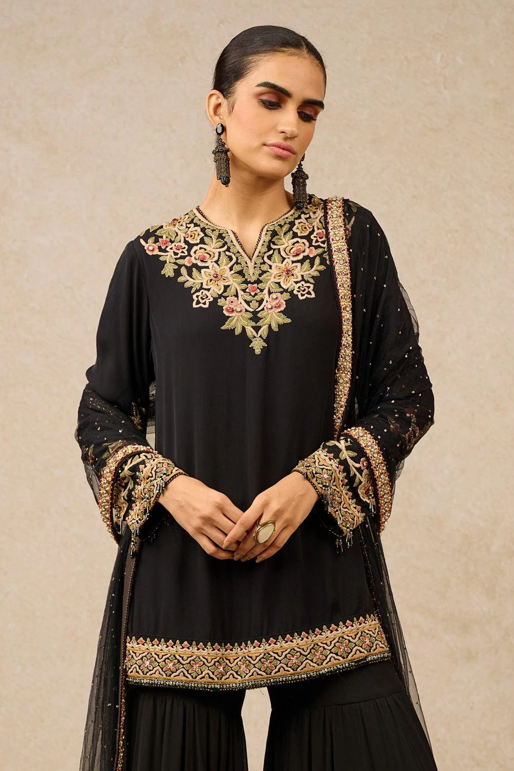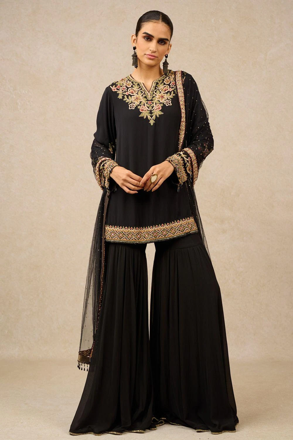 Indulge in exquisite craftsmanship with this kurta, adorned by intricate Gara embroidery. Paired seamlessly with a matching sharara, and complemented by a hand-embroidered tulle dupatta featuring charming tassels for a refined ensemble.