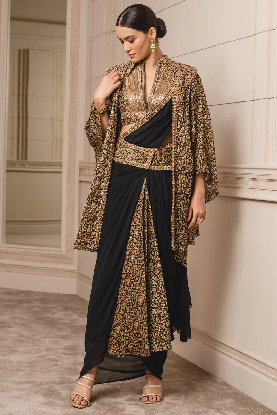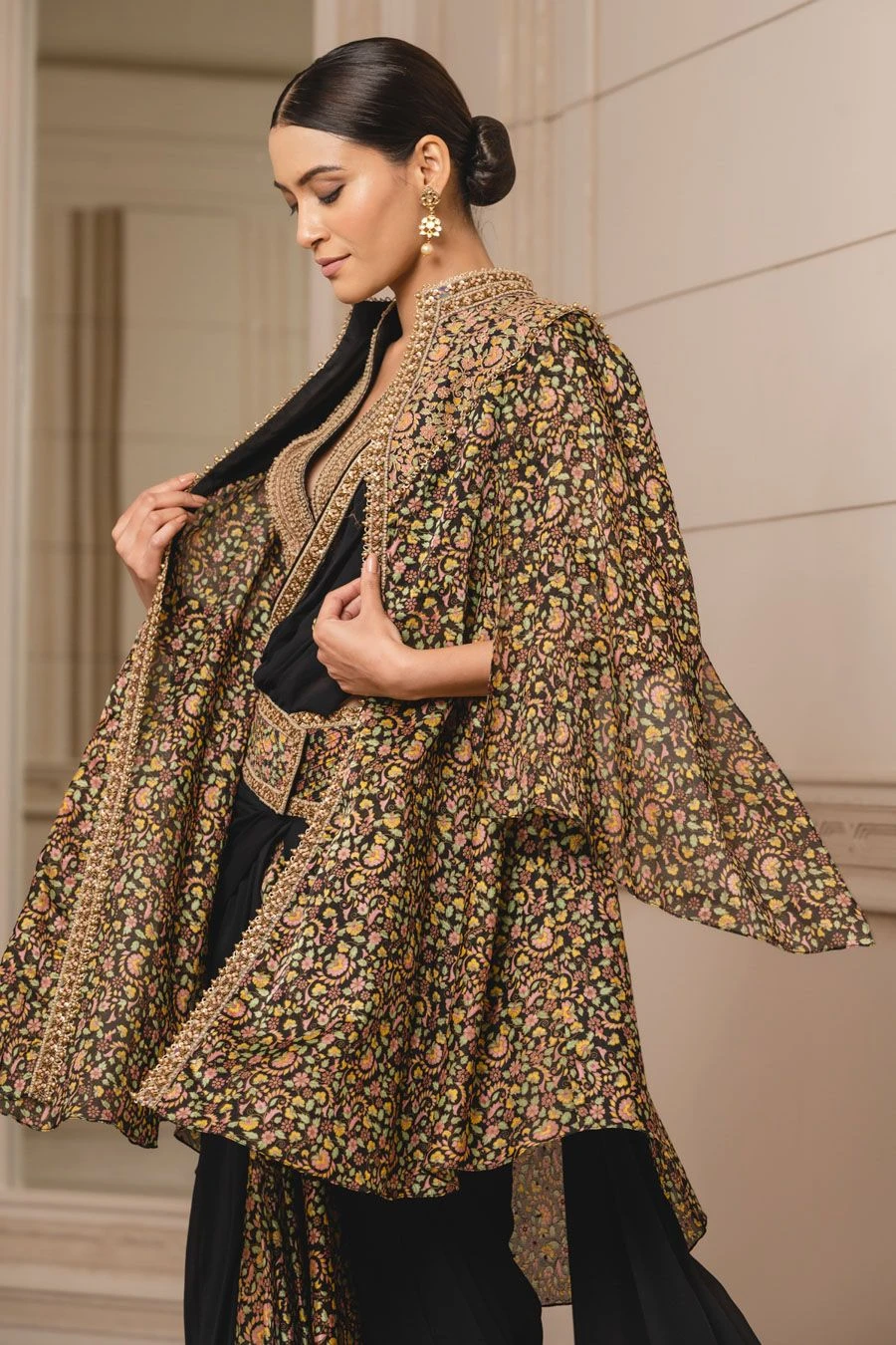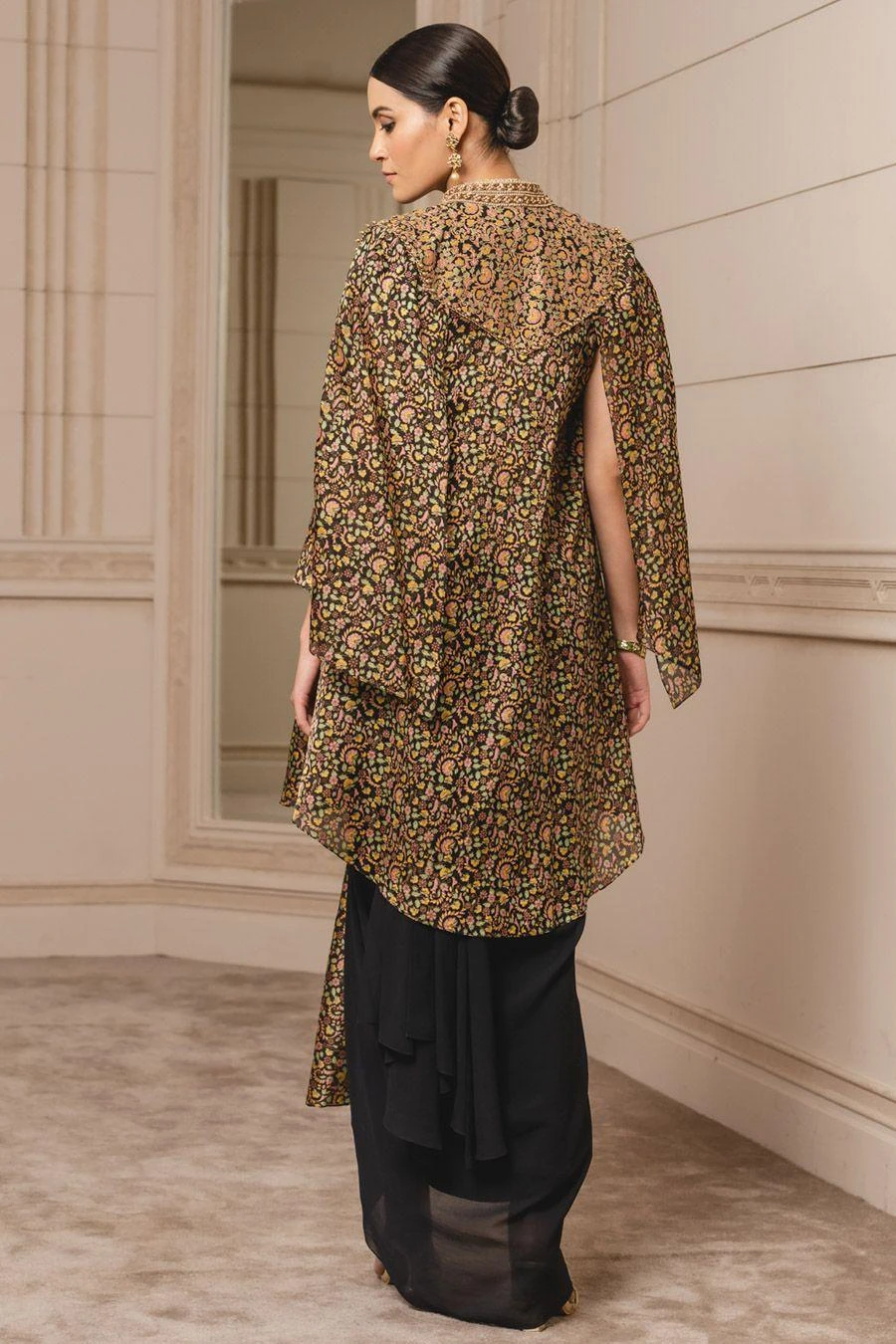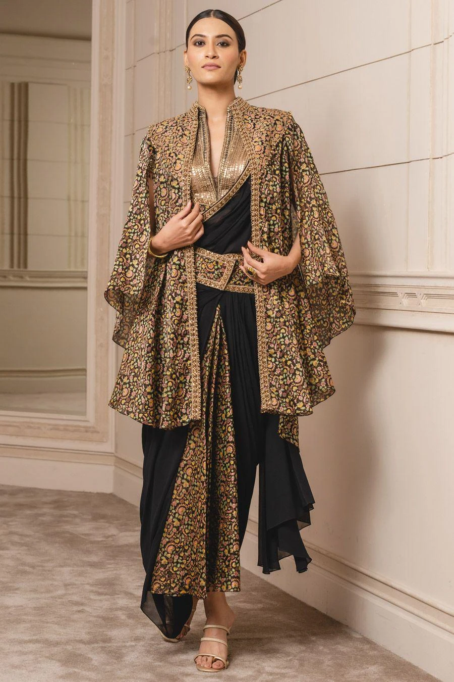 This printed cape in satin-organza fabric is uplifted with kashida embroidery all over. It has a silk-dupion yoke and gold borders along the neckline. Layer it over a concept sari from the collection to complete the set.