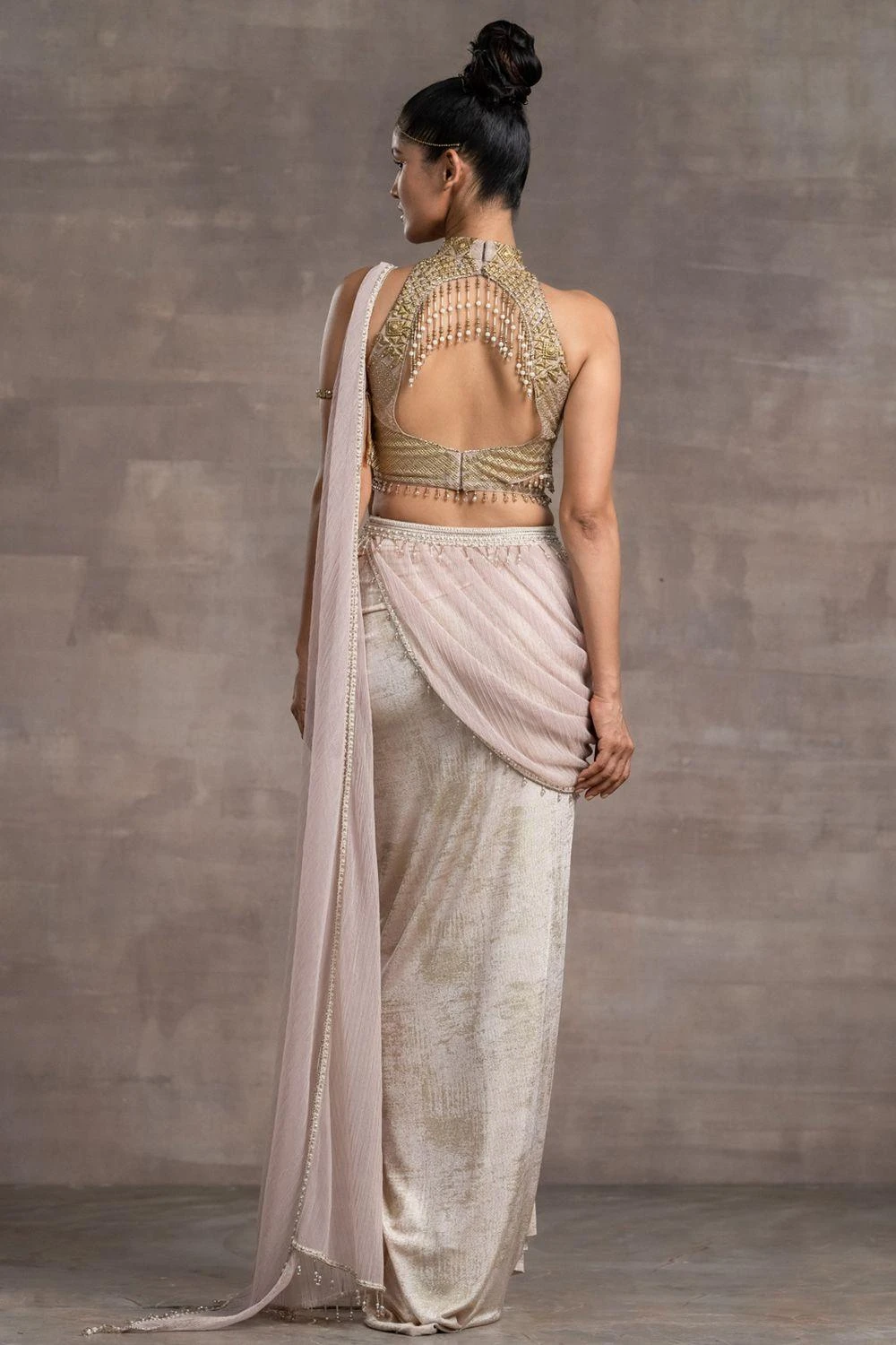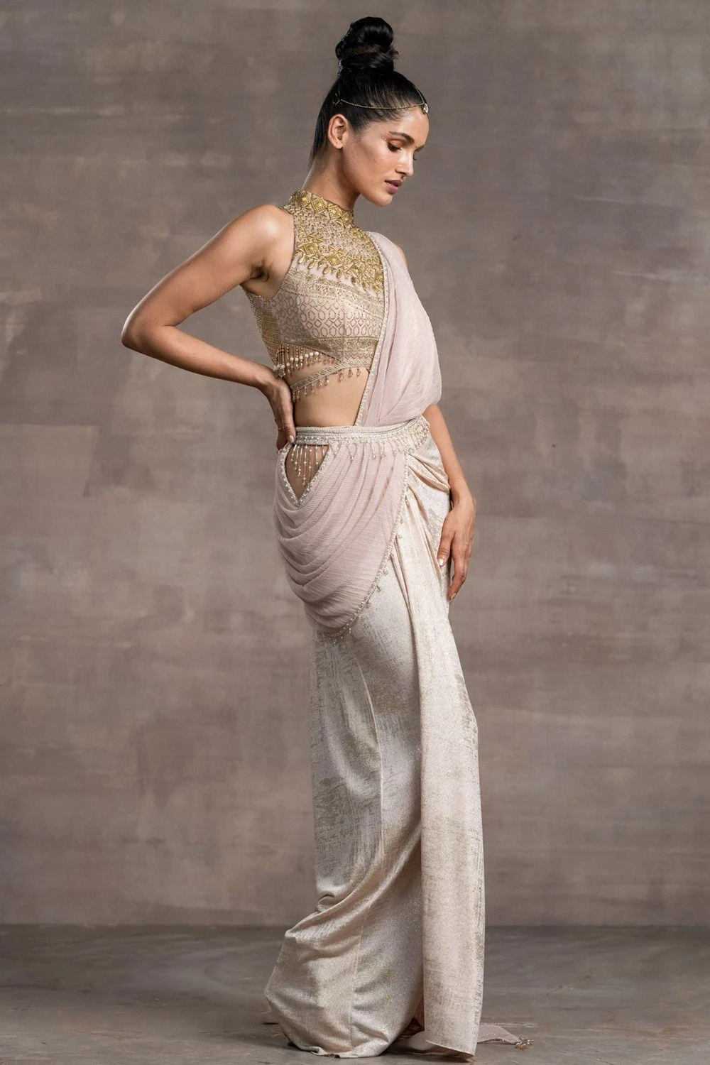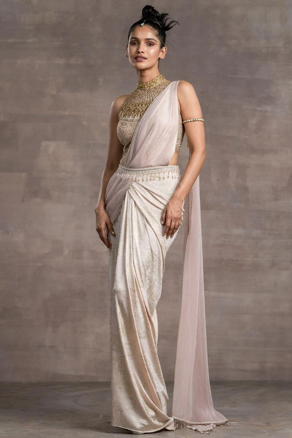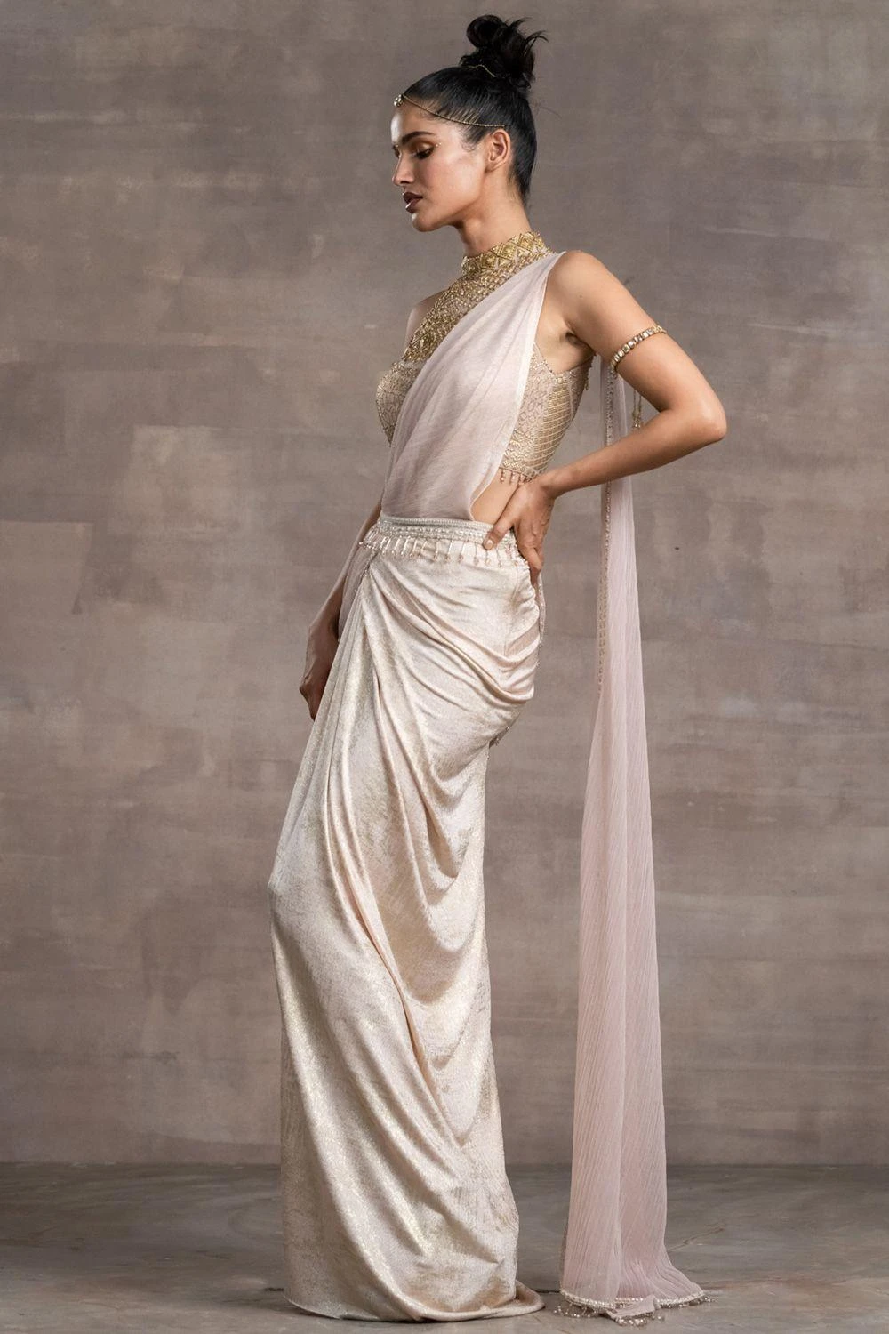 This concept sari designed with a foil-jersey fabric is offset with a jewelled blouse with an elaborate high neckline. The fringed tulle pallu is a delicate addition to the ensemble. Style it with a pair of statement earrings to complete the look.