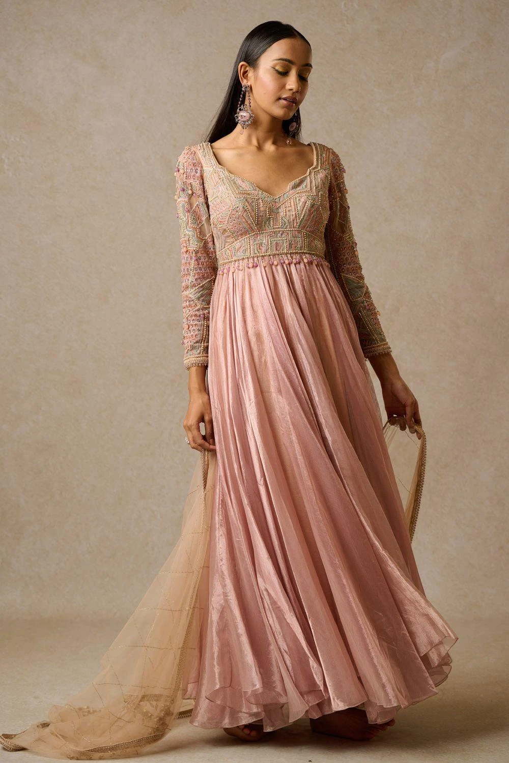 Step into opulence with this anarkali. The hand-embroidered bodice, adorned with tasteful tassels, adds elegance. Paired with a churidar & dupatta embellished with intricate braids and Swarovski crystals, this ensemble radiates grandeur.