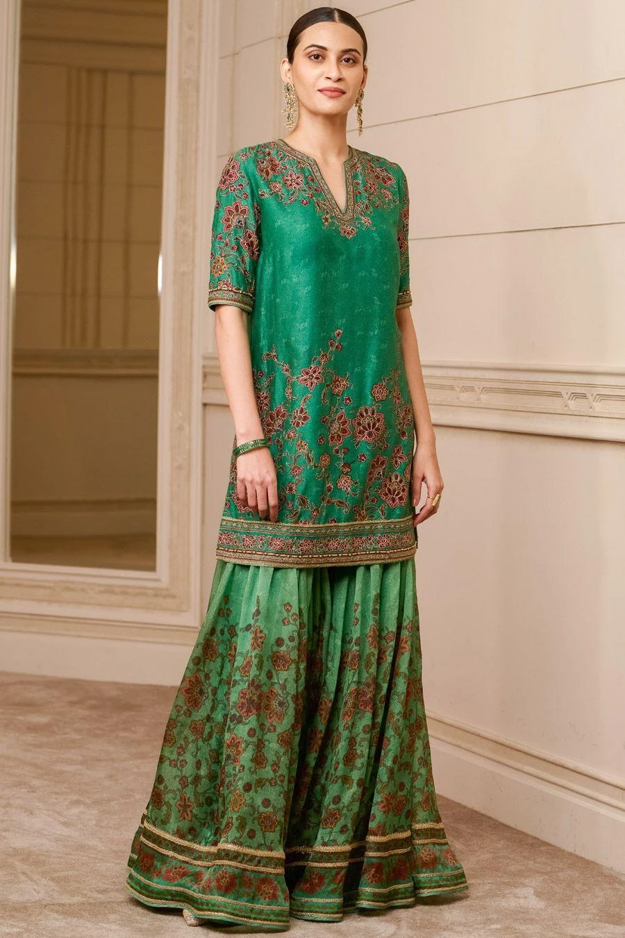 This embroidered kurta with subtle floral motifs is paired with an equally versatile sharara and dupatta. Style this set with a pair of statement earrings & a potli to complete the look.