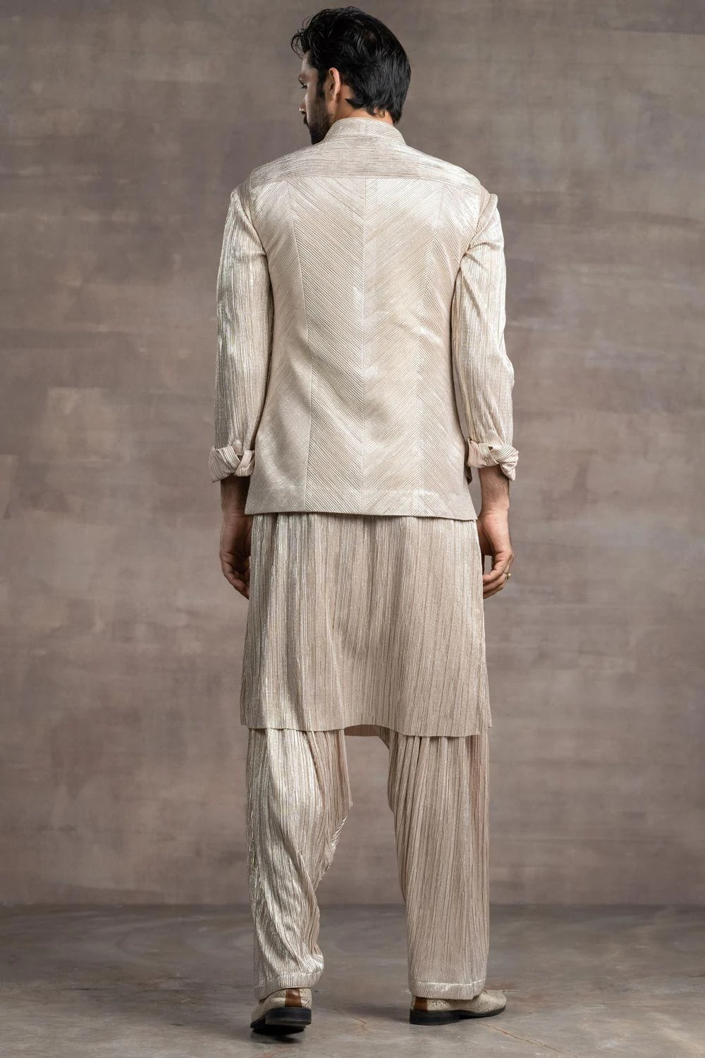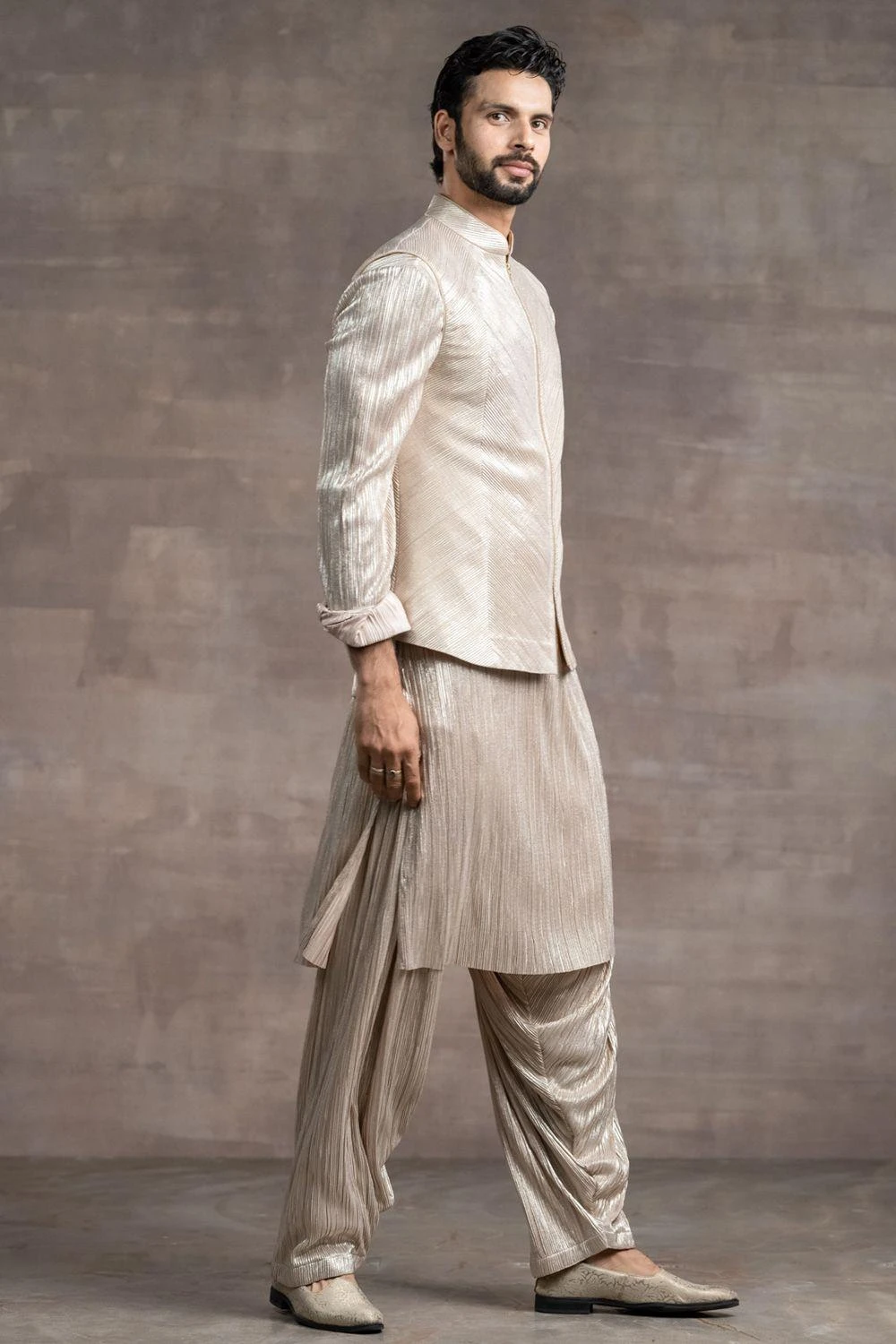 This jacket set will see you through all kinds of celebrations this upcoming wedding season. This set comes with a gold crinkled bundi detailed with a metallic zipper & paired with a kurta and trousers. Style it with a shawl to complete the look.