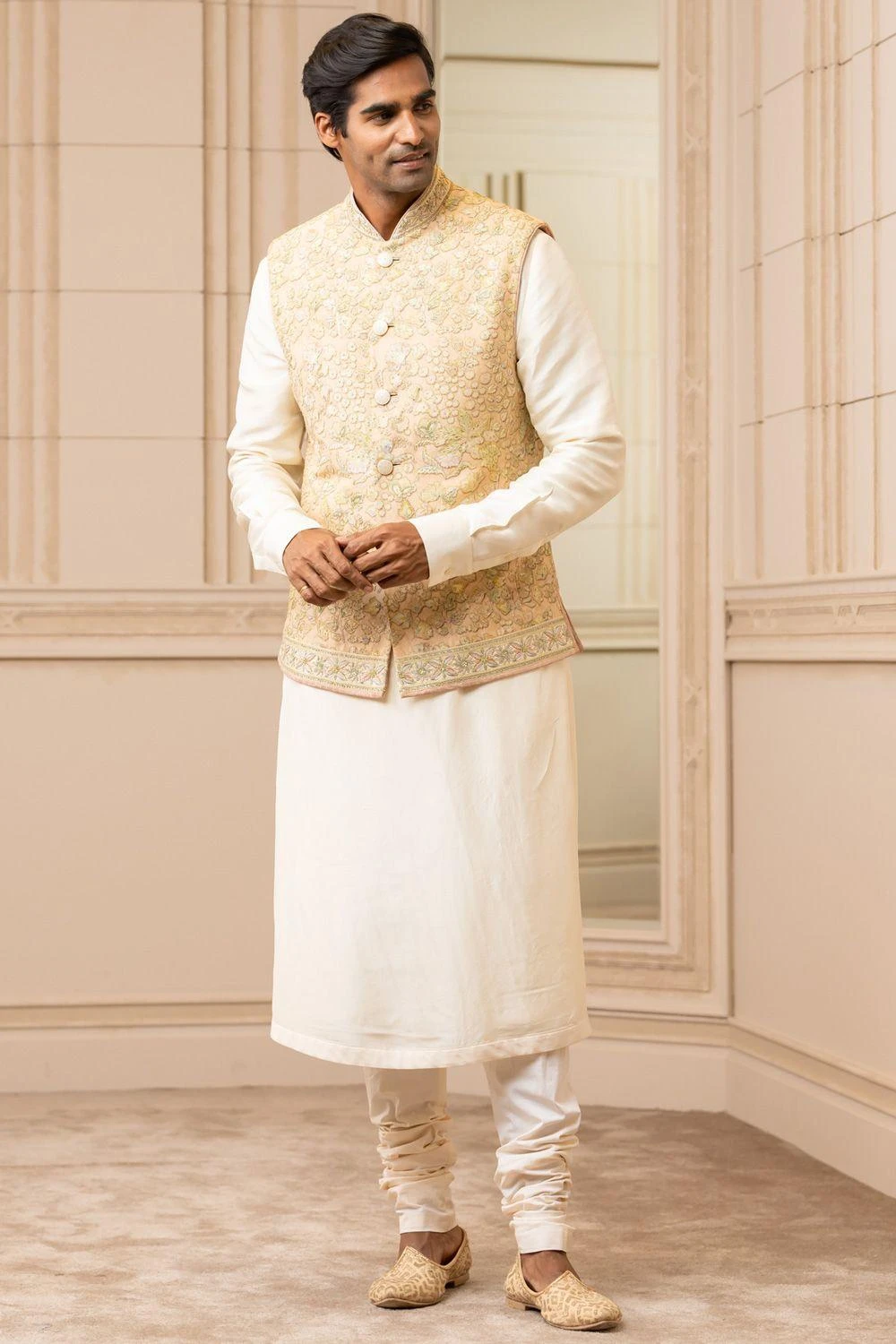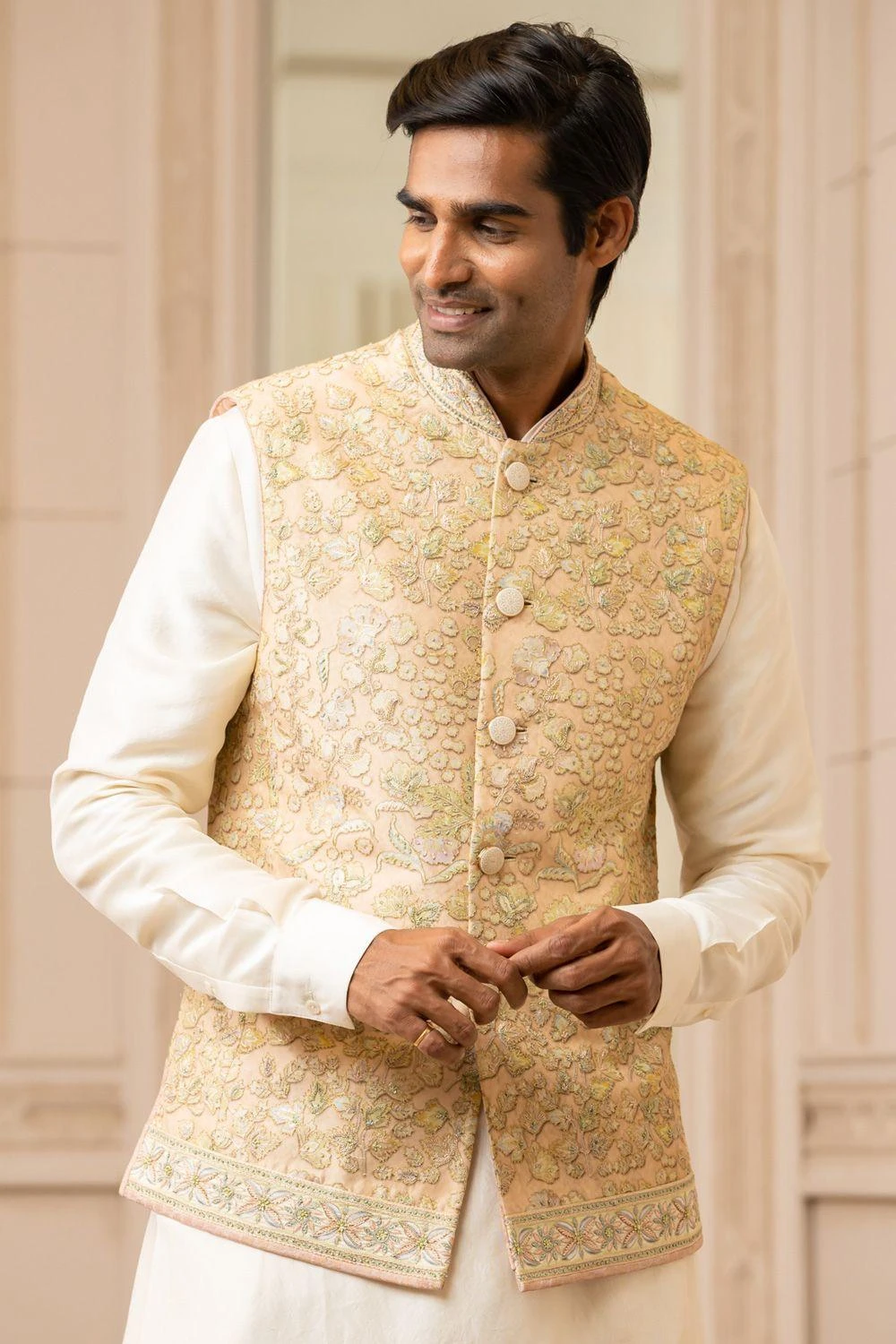 Give your basic kurta set an upgrade with this ivory and salmon floral-printed bundi that is embroidered in aari and zardosi thread work all over. The jacket is also adorned with ivory enamel buttons.