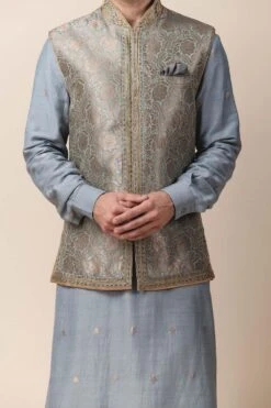 This jade green bundi jacket is woven in brocade with highlighted collars. The collar and the hem is embellished with zardosi border. Pair it with subtle blue kurta and churidaar set to finish the look.