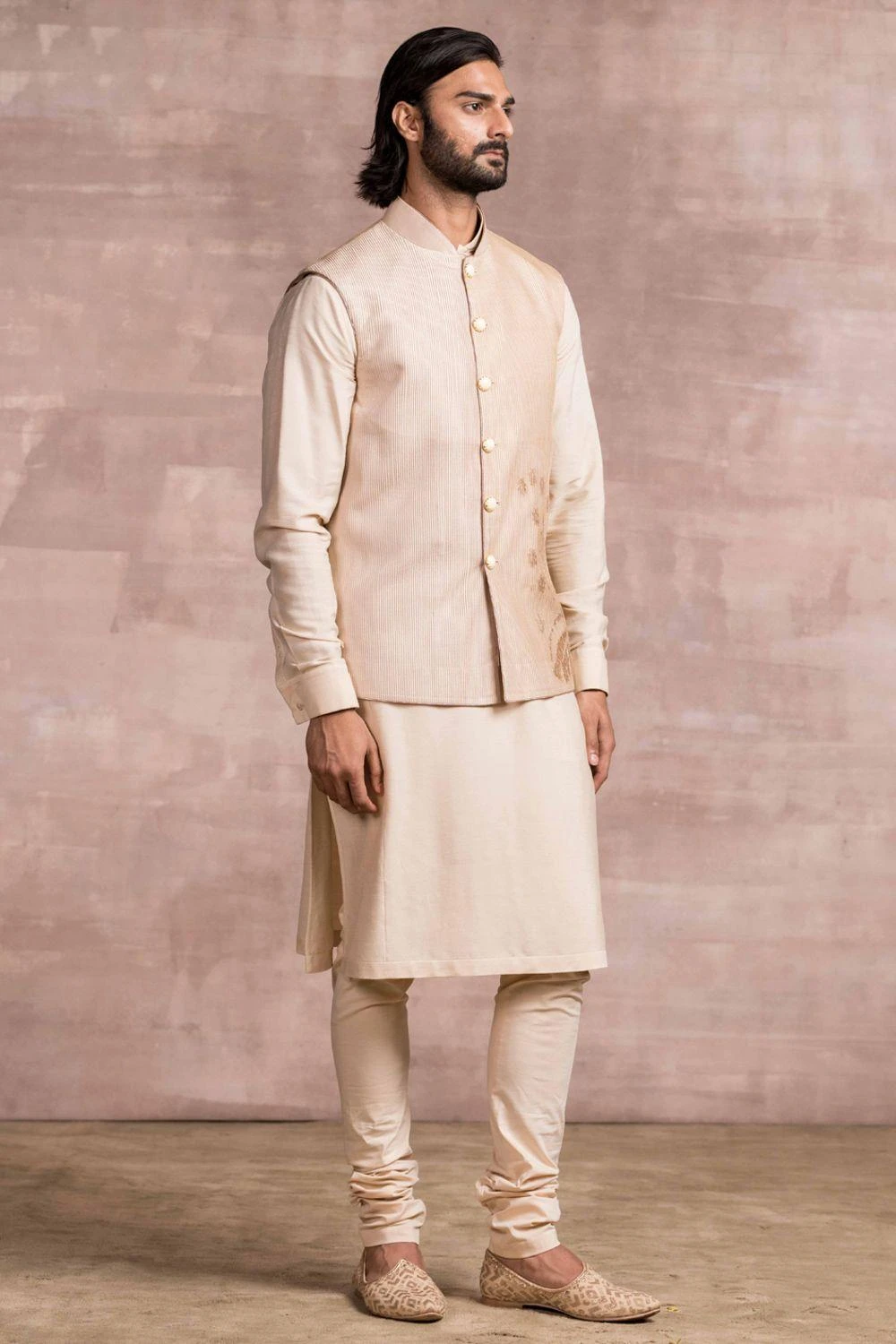 This light gold bundi jacket is crafted in spun silk fabric with all over texturing and enhanced with a gota applique motif in the side. You can style it with a coordinating ivory kurta set from the collection.