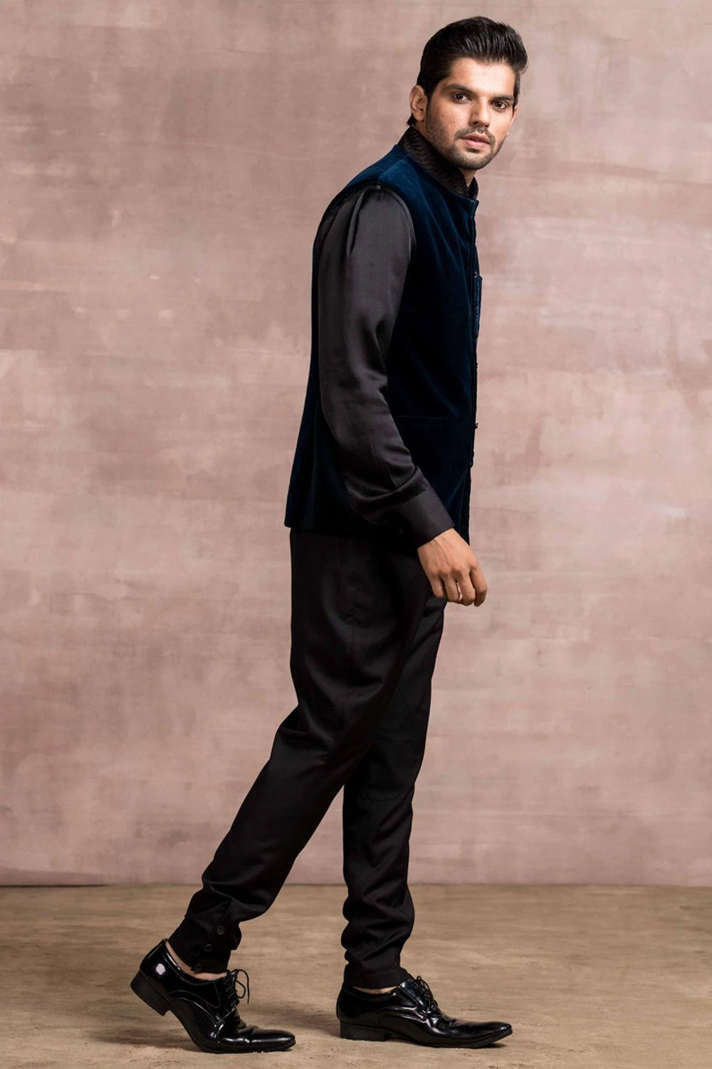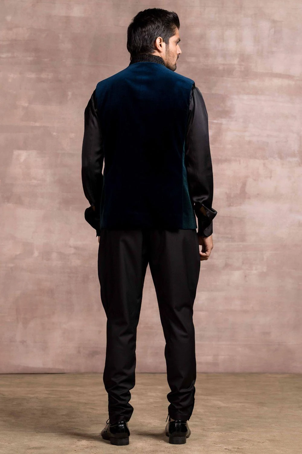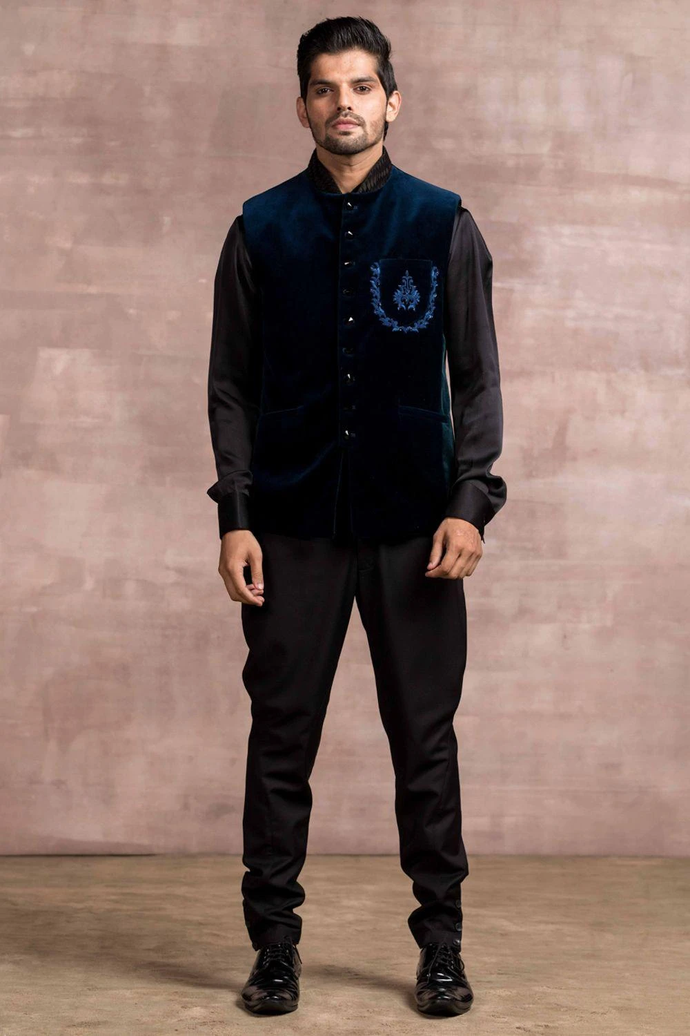 Look absolutely dapper in this teal bundi set. It consists of a cotton velvet bundi jacket with weave detail on the collar & pocket. It is paired with a satin shirt and Jodhpuri pants in suiting fabric.