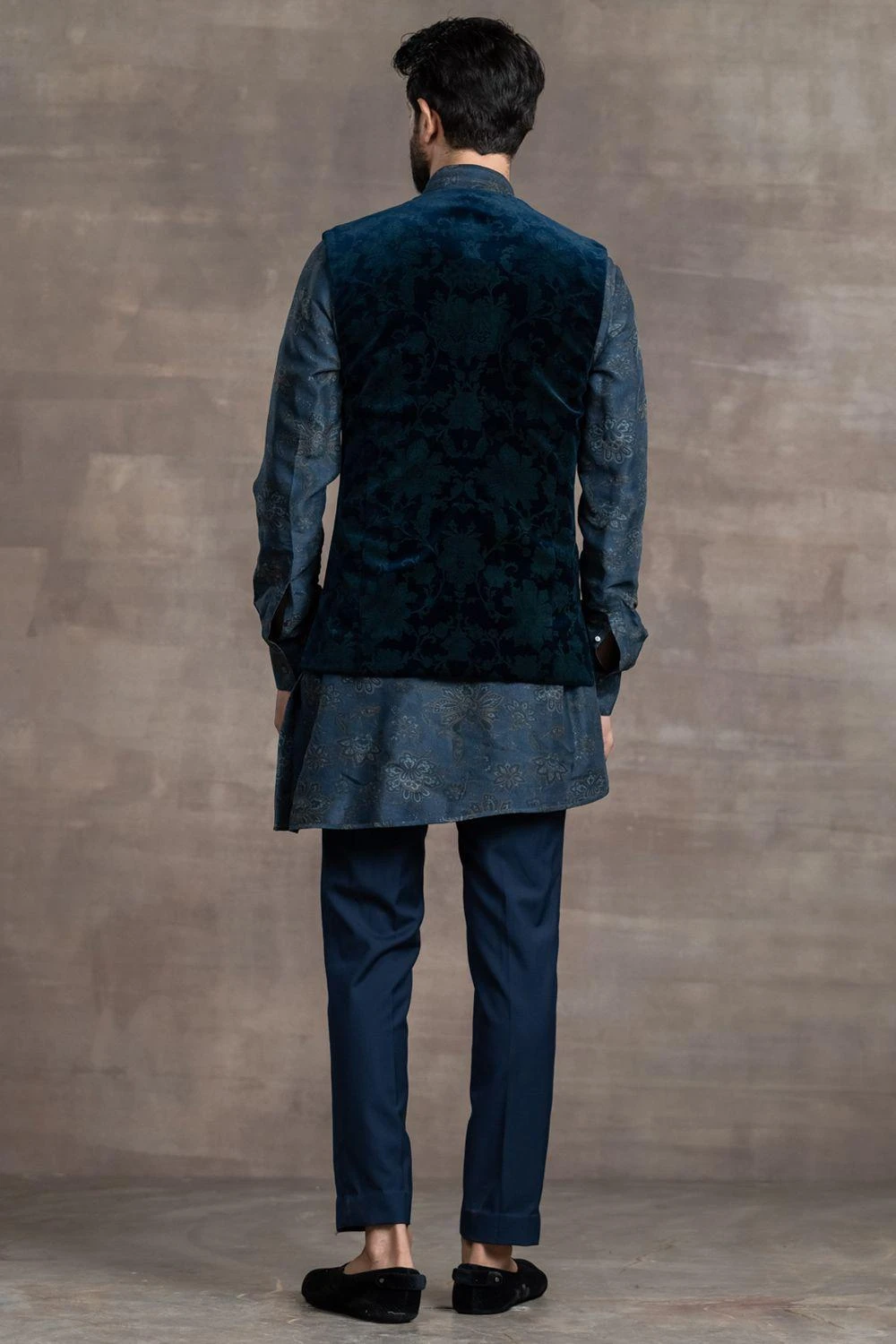 This jacket set will see you through all kinds of celebrations this upcoming wedding season. This set comes with an etched velvet bundi jacket paired with a kurta and trousers. Style this set with a shawl to complete the look.