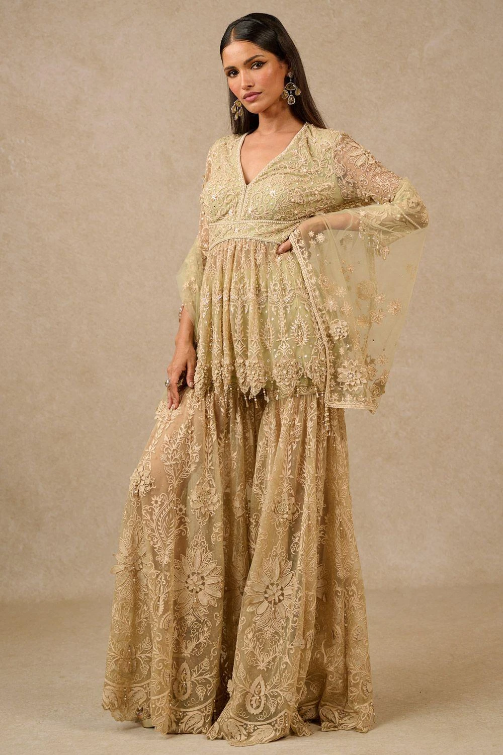 Indulge in opulence with this soft net peplum kurta, adorned in intricate pearl and sequin embroidery. Paired harmoniously with a matching sharara, featuring similar detailing on soft net, and complemented by a delicately highlighted tulle scarf.