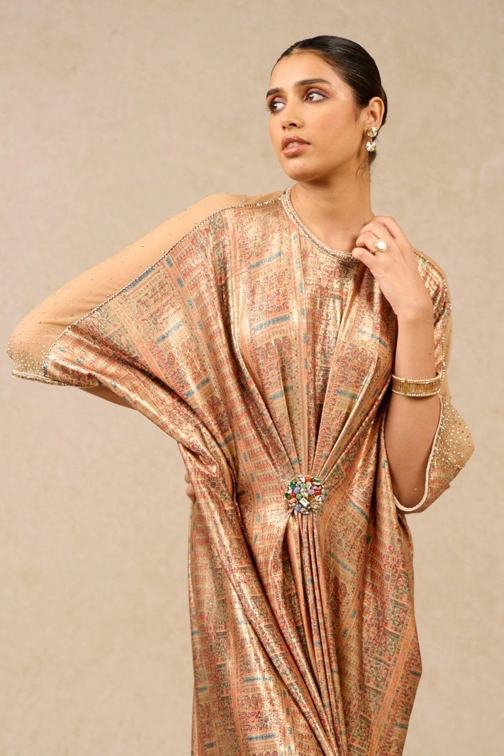 Indulge in opulence with this printed kaftan dress in radiant foil jersey, adorned with an intricate embroidered border and a striking chunky brooch at the waist. It’s a masterpiece of modern sophistication.