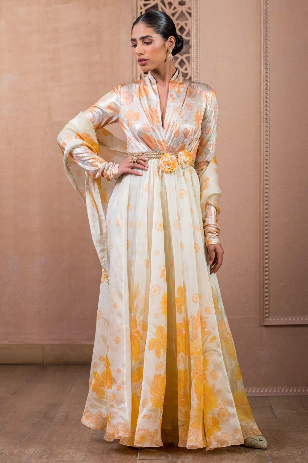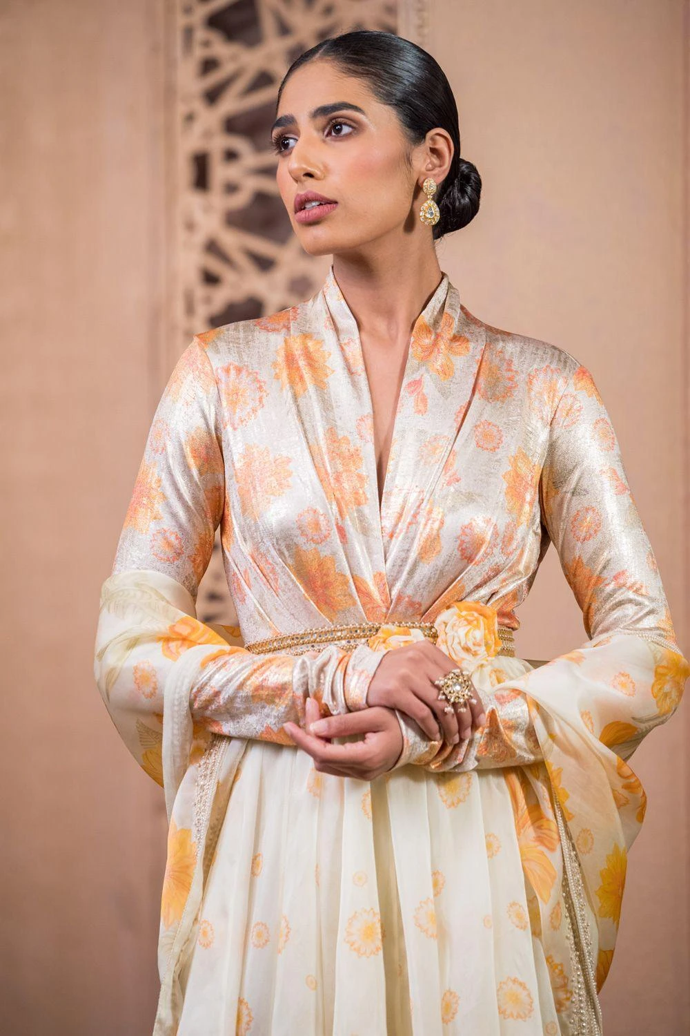 This hand-painted & printed anarkali features a plunging V-neck bodice with an embroidered border and 3D flowers on the waistline. The piece is paired with a stretch net churidar and triangular scarf that is detailed with borders and laces.