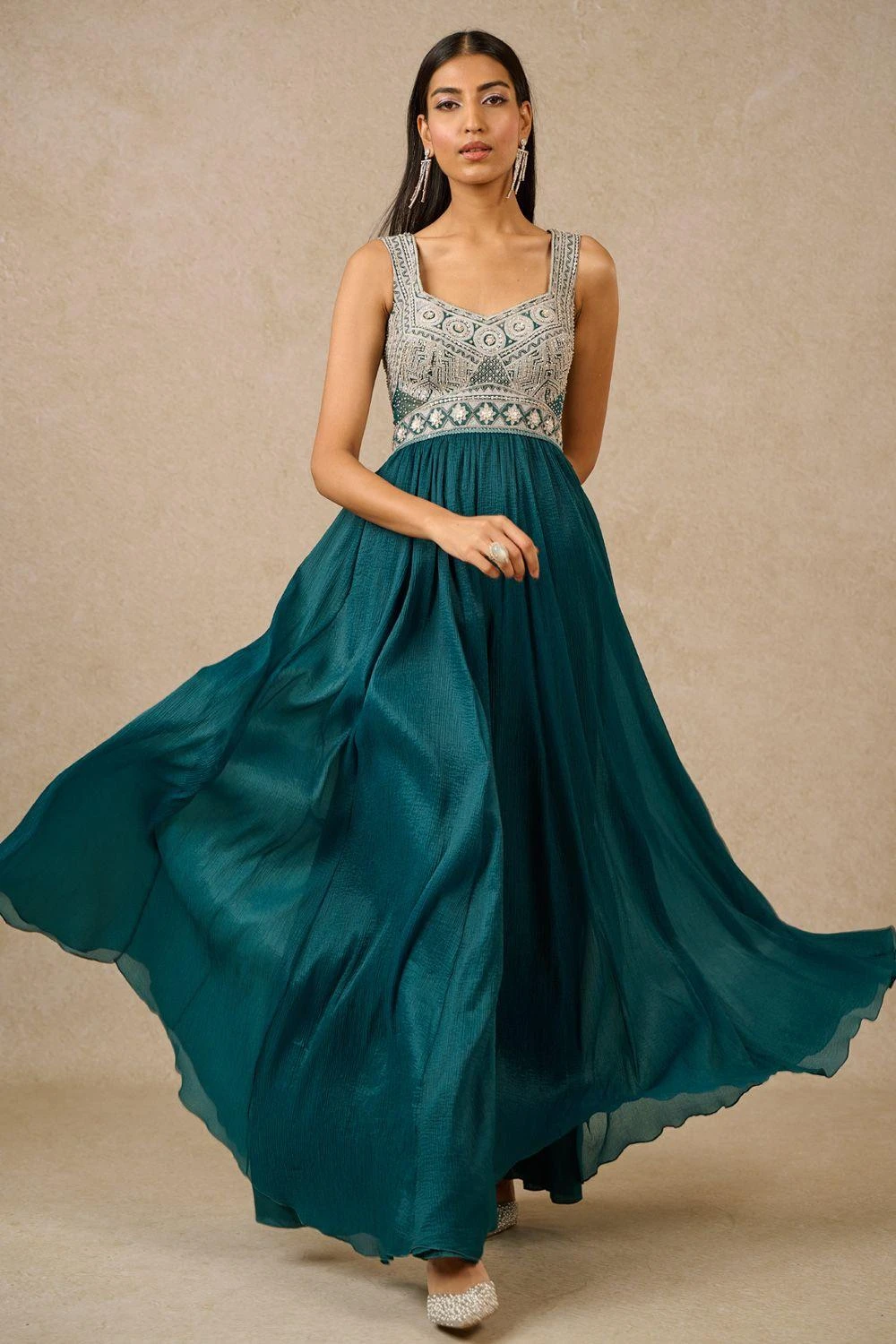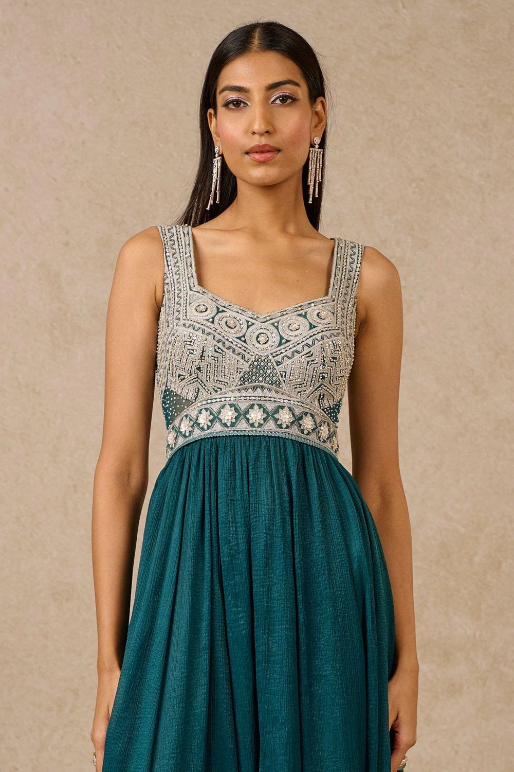 Indulge in elegance with this crinkled organza jumpsuit. It showcases an Art Deco embroidered bodice, combining contemporary style with timeless craftsmanship. Add a pair of statement earrings to complete the look.