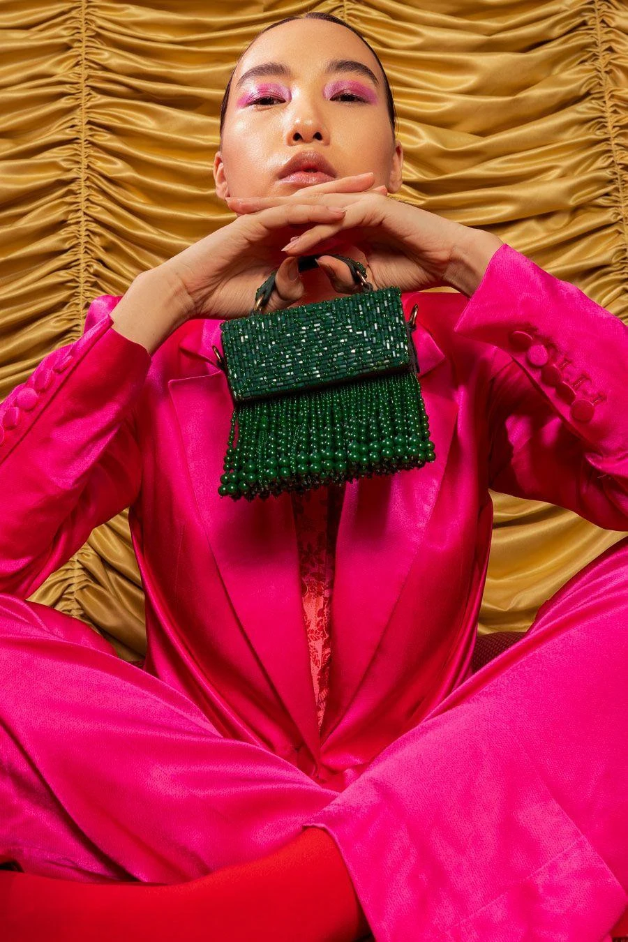 The Annette box bag is a party on its own. Crafted in micro velvet, this bag features glass pearl tassels and crystals on the flap. Carry it to your next soiree and be the centre of everyone’s attention.