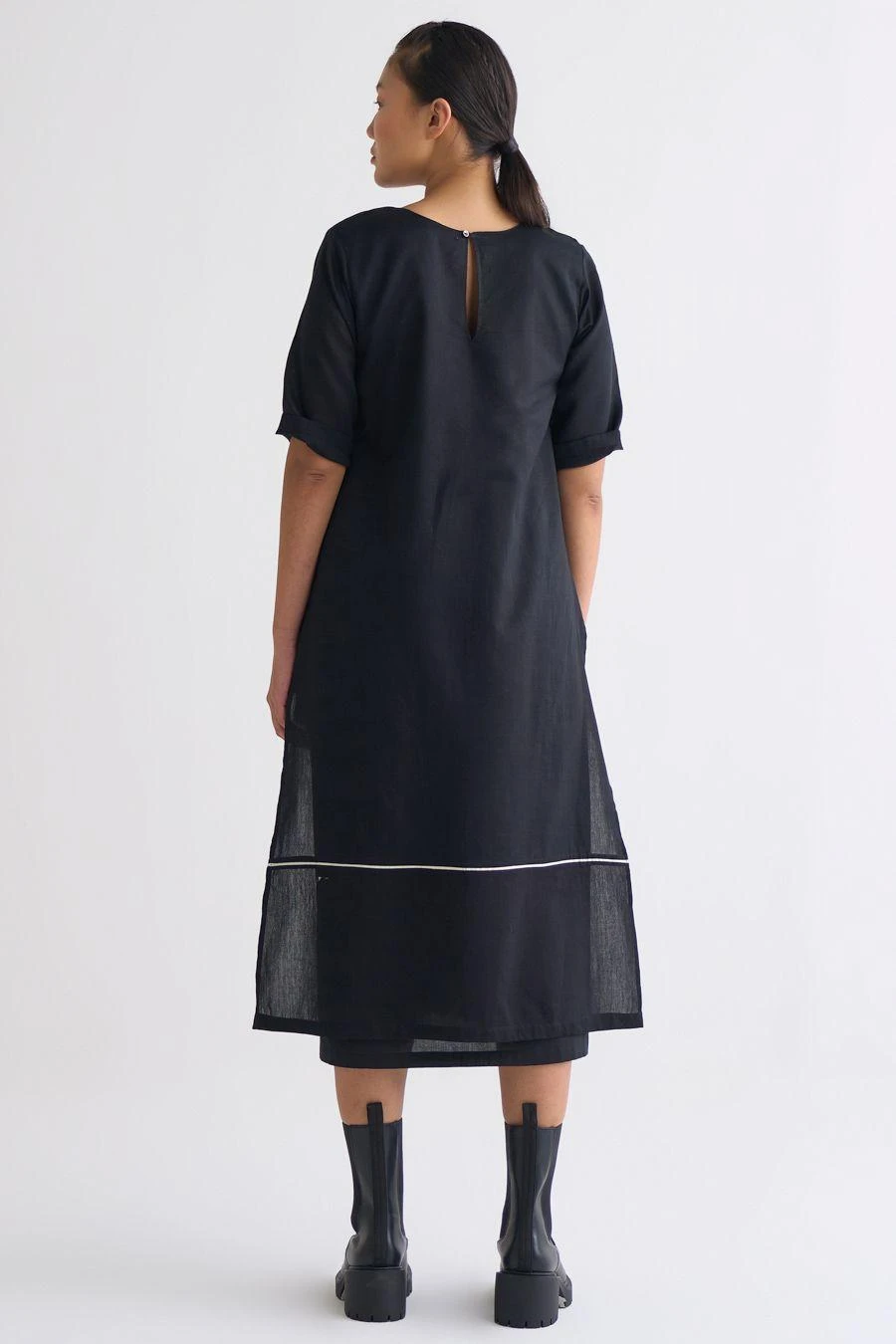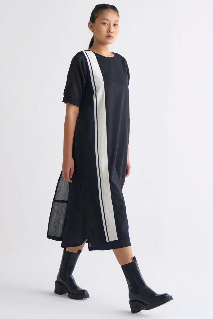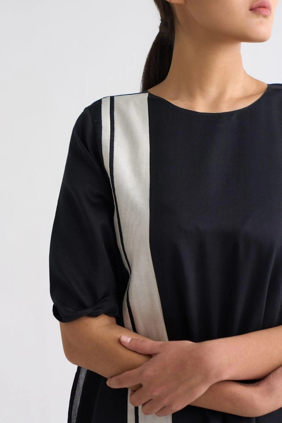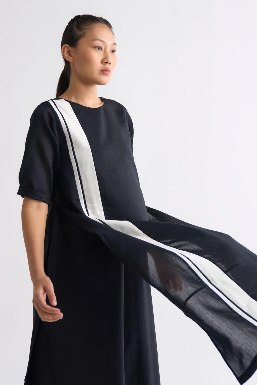 Three’s AW collection is an amalgamation of angular architectural cuts, neutral tines, cut-out backs and a play of stripes. Crafted in chanderi, this dress features an ivory stripe applique detail with a cotton mul under layer.